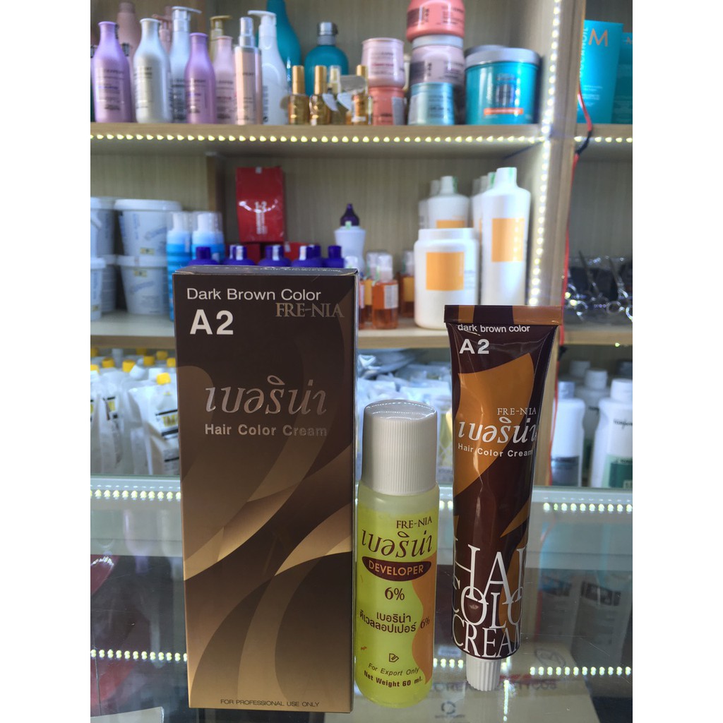Phân loại: + A1 - đen + A2 - nâu * Cách dùng: - Trộn kem nhuộm tóc với nước Hydrogenperoxide(trợ nhuộm) - Quậy đều và dùng bàn chải, chải đều lên tóc, để lại 20 phút, xả sạch bằng nước. * Lưu ý khi sử dụng - Không cho vào mắt. - Nên thử kích ứng da trước khi dùng(thoa sản phẩm lên dưới cánh tay hoặc sau vành tai, để lại 24 giờ, nếu có triệu chứng dị ứng, ngứa, không nên sử dụng sản phẩm này.) - Không sử dụng khi da đầu có vết trầy. - Không sử dụng để nhuộm lông mi hoặc lông mày. * Bảo quản: - Bảo quản nơi khô ráo, thoáng mát. - Tránh sản phẩm tiếp xúc trực tiếp dưới ánh nắng mặt trời . - Tránh để sản phẩm trong tầm với trẻ em.