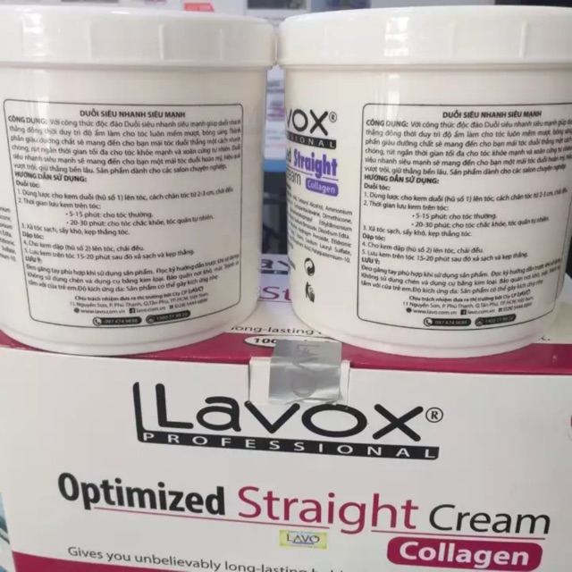 DUỖI SIÊU NHANH SIÊU MẠNH COLLAGEN LAVOX CÔNG DỤNG Duỗi siêu nhanh siêu mạnh collagen giúp duỗi nhanh thẳng đồng thời duy trì độ ẩm làm cho tóc luôn mềm mượt, bóng sáng. Thành phần giàu dưỡng chất sẽ mang đến cho bạn mái tóc duỗi thẳng một cách nhanh chóng, rút ngắn thời gian tối đa cho tóc khỏe mạnh tự nhiên. Duỗi siêu nhanh siêu mạnh collagen sẽ mang đến cho bạn một mái tóc duỗi hoàn mỹ, hiệu quả vượt trội, giữ thẳng bền lâu. DUNG TÍCH 1000ml x2 HƯỚNG DẪN SỬ DỤNG Duỗi tóc: 1. Dùng lược cho kem duỗi (hũ số 1) lên tóc, cách chân tóc từ 2-3 cm, chải đều. 2. Thời gian lưu kem trên tóc: 3. 5-10 phút: cho tóc thường. 4. 15-20 phút: cho tóc chắc khỏe, tóc quăn tự nhiên. 3. Xả tóc sạch, sấy khô, kẹp thẳng tóc. Dập tóc: 4. Cho kem dập (hũ số 2) lên tóc, chải đều. 5. Lưu kem trên tóc 10-15 phút sau đó xả sạch và kẹp thẳng.
