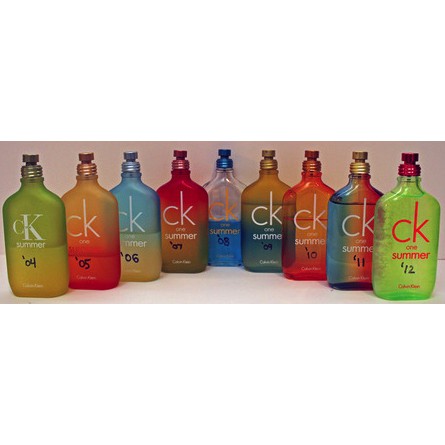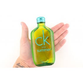 Nhóm nước hoa: Hương cam chanh thơm ngáT Giới tính: Unisex Độ tuổi khuyên dùng: Trên 25 Năm ra mắt: 2014 Nồng độ: EDT Độ lưu hương: Tạm ổn - 3 giờ đến 6 giờ Độ toả hương: Gần - Toả hương trong vòng một cánh tay Thời điểm khuyên dùng: Ngày, Hạ phong cách: Trẻ trung , Quyến rũ , Cá tính Điểm tốt: Một mùi hương đầy tươi mát và sảng khoái, mang lại cảm giác như đang nhấm nháp một ly cocktail trái cây ngon lành. Hương thơm toát lên sự trẻ trung cho cả nam giới lẫn nữ giới. Chưa tốt: Hương thơm khá kén chọn thời điểm sử dụng trong năm, hầu như chỉ sử dụng được vào mùa hè. Mùi rượu có thể khiến cho nước hoa không thích hợp với không gian văn phòng. Tổng quan: Thương hiệu Calvin Klein đã tiếp tục truyến thống mỗi năm một lần cho ra mắt phiên bản mới của dòng nước hoa CK One Summer và phiên bản lần này là CK One Summer 2014 được tung ra vào tháng 1 năm 2014. Hương thơm của phiên bản này nhấn mạnh về tinh thần trẻ trung, tinh nghịch và có một nét sàng điệu rõ rệt. Hình ảnh của những bữa tiệc bãi biển,với bờ cát vẫn còn ấm, sóng biển dạt dào, âm nhạc và những ly cocktail đều được sử dụng để làm nguồn cảm hứng cho chai nước hoa này. Thương hiệu Calvin Klein đã tiếp tục truyến thống mỗi năm một lần cho ra mắt phiên bản mới của dòng nước hoa CK One Summer và phiên bản lần này là CK One Summer 2014 được tung ra vào tháng 1 năm 2014. Hương thơm của phiên bản này nhấn mạnh về tinh thần trẻ trung, tinh nghịch và có một nét sàng điệu rõ rệt. Hình ảnh của những bữa tiệc bãi biển,với bờ cát vẫn còn ấm, sóng biển dạt dào, âm nhạc và những ly cocktail đều được sử dụng để làm nguồn cảm hứng cho chai nước hoa này. Hương thơm của nước hoa toát lên phong vị mát lạnh và sảng khoái của bưởi chùm và chanh xanh ngay tại lớp hương đầu và mau chóng được kết hợp thêm với hương chanh vàng mọng nước. Tiếp đến, mùi hương tươi vui của hỗn hợp cocktail bao gồm rượu tequila, hoa lan Nam Phi trắng và cây bách xù chào đón người dùng ở lớp hương giữa. Cuối cùng, hương thơm toát lên một vị ngọt của nước dừa và đường, thêm vào đó là sự sâu lắng của nốt hương gỗ tuyết tùng. Phiên bản 2014 này xuất hiện dưới mẫu chai CK One truyền thồng được thiết kế bởi Fabien Baron, nhưng nay đã được thay bằng một màu vàng - xanh lam - lục neon rạng rỡ hơn.