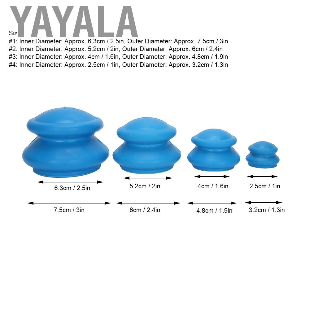 --------------☀Welcome to Yayala☀------------- ✔Good Quality✔Available✔Lowest Price ✈Shipping from oversea,items will arrive your home in 1-2 week. ⏩If you follow us and screenshot to us, you will have a free gift. ❀Please Enjoy Your Shopping Time↖(^ω^)↗ Feature: 1. Exquisite and compact, it will not take up much space to carry around. 2. Soft texture, simple structure, convenient and practical, strong suction. 3. Because the mouth of the cup is soft and deformable, it is easy to cup on the joints and other uneven parts. 4. Made of high quality silicone material, no pungent odor, non‑toxic and durable. 5. 4pcs of cupping cup are available for use, meet your different needs. Specification: Condition: 100% Brand New Item Type: Cupping Therapy Set Material: Silicone Size: #1: Inner Diameter: Approx. 6.3cm / 2.5in, Outer Diameter: Approx. 7.5cm / 3in #2: Inner Diameter: Approx. 5.2cm / 2in, Outer Diameter: Approx. 6cm / 2.4in #3: Inner Diameter: Approx. 4cm / 1.6in, Outer Diameter: Approx. 4.8cm / 1.9in #4: Inner Diameter: Approx. 2.5cm / 1in, Outer Diameter: Approx. 3.2cm / 1.3in Usage: 1. Buckle the tank body on the suction part. 2. Place the thumbs of both hands on the bottom edge of the tank, and place the rest of the fingers on the top of the tank. 3. One side of the tank is slightly upwards, leaving gaps between the mouth of the tank and the skin. 4. Both hands simultaneously squeeze the tank body to the middle, so that the air is discharged from the gaps. 5. Quickly buckle the tank body to the suction part, and then release your hands. 6. Generally leave the tank for 20-30 minutes. 7. When removing the can, press the muscles with your hands to get air into the can, and then gently remove it, do not pull it forcefully. 8. Store in a cool place after use, away from oil, heat, or sun. Using the principle of negative pressure, the fitness tank is deformed under pressure to produce suction and pulling force. The operation is flexible and simple. The tank can be dropped on multiple parts of the body at the same time, and the strength can also be adjusted. Precautions: 1. Please clean the cup mouth and acupuncture points area with ethanol or white wine before cupping. 2. When cupping, do not squeeze the mouth of the can, it is round, the strength can be determined according to individual physical condition or feeling, the time should not exceed 20 minutes. 3. In order to prevent mutual infection of diseases, it is forbidden to use by multiple people, and it should be used by dedicated person. Use Taboo: 1. Cupping is not suitable for carotid arteries, body ulcers and rotten parts. 2. Cupping is not suitable for patients with tetanus, epilepsy, heart disease, pregnant women, renal and respiratory failure, and those with extremely weak body. 3. Patients with skin diseases should not share cupping with others. Package List: 4 x Cupping Cup 1 x English Manual Note: 1. Please allow slight error due to manual measur