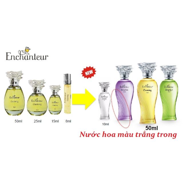 Nước hoa cao cấp Enchanteur mẫu mới Charming-Magic-Romantic (50ml) Nước hoa Cao Cấp Enchanteur Charming (50ml) mang hương thơm nồng nàn, quyến rũ, cho bạn nữ thêm ngọt ngào và lôi cuốn mỗi khi xuất hiện. Thành phần hương hoa chiết xuất từ thiên nhiên cho hương thơm bền lâu, bung tỏa theo từng cử động. Thông tin sản phẩm Hương thơm quyến rũ Enchanteur Charming mới chứa tinh dầu nước hoa lưu hương lâu làm tăng thêm nét duyên dáng, gợi cảm của phái đẹp. Cho bạn tận hưởng phút giây lãng mạn, cảm xúc ngất ngây trong hương thơm quyến rũ, nồng nàn của Enchanteur Mùi hương bền lâu Được sản xuất trên dây chuyền, công nghệ hiện đại cùng những thành phần thiên nhiên tuyệt hảo khiến cho việc lưu giữ mùi hướng trên cơ thể được lâu hơn. Sự lựa chọn thông minh cho chị em phụ nữ Enchanteur Charming là sự lựa chọn hoàn hảo cho những cô nàng yêu thích các mùi hương, chúng sẽ làm cho bạn thêm phần quyến rũ, là nét tô điểm cho vẻ đẹp của mình. Thiết kế chai dễ thương đầy nữ tính. Hướng dẫn sử dụng - Phun lên các điểm có mạch đập của cơ thể: cổ, ngực, cổ tay, sau 2 tai, lên đầu gối, lên tóc... Không được chà xát vì có thể phá vỡ các phân tử nước hoa và làm cho nước hoa nhanh bị mất mùi. - Để giúp hương thơm được phát tán đều trên cơ thể, hãy xịt nước hoa lên không khí ở phía trước mặt, sau đó bước vào #Enchanteur #NướcHoa #NuocHoa #Nước #Hoa #nuochoaenchanteur50ml