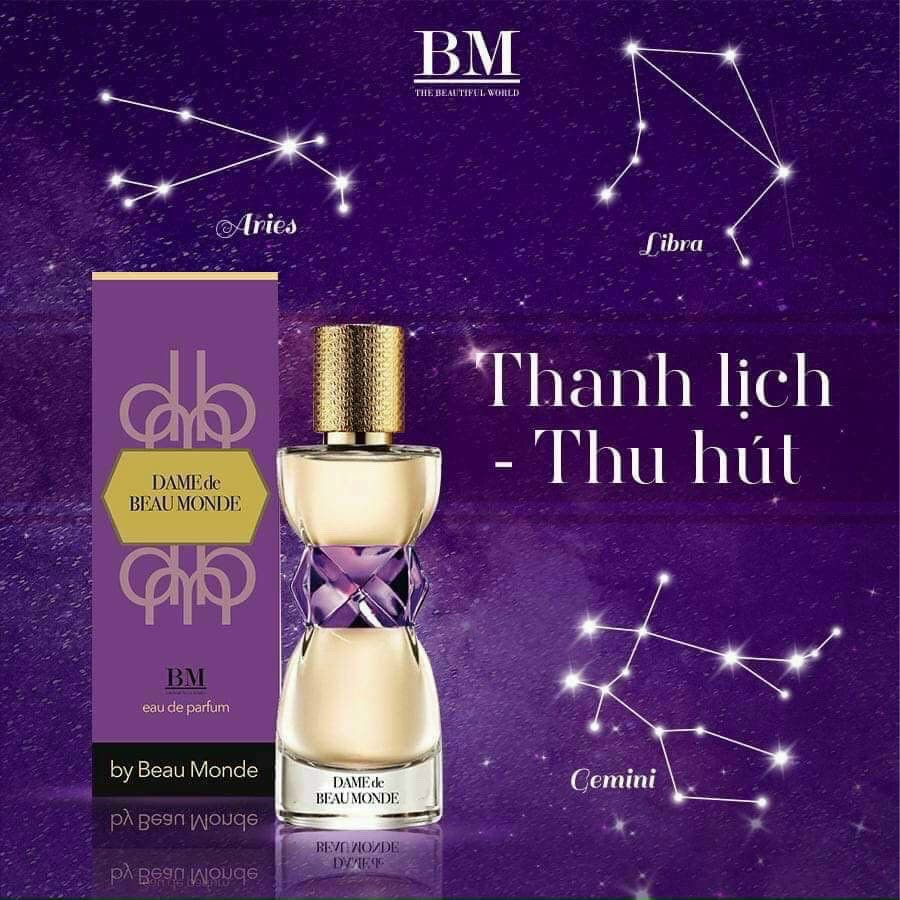 Nước Hoa Nữ Cao Cấp Dame de Beau Monde by BM 25ml Với Dame de Beau Monde ngọt ngào, quyến rũ nàng sẽ trở thành tâm điểm của các buổi tiệc đêm, lung linh và lấp lánh. - Tầng hương: + Hương đầu: chanh, ngải giấm, quýt. + Hương giữa: hoa oải hương, gỗ tuyết tùng, táo. + Hương cuối: hổ phách, vani, xạ hương. Thành phần: Alcohol, Fragrance, Water, Grasse, 06130 Hướng dẫn sử dụng: Giữ cách thân khoảng 8 cm và xịt lên cơ thể. Lưu ý: Dễ cháy. Không được xịt vào mắt. Không để nơi có nhiệt độ cao. Tránh ánh sáng trực tiếp. Để ngoài tầm tay trẻ em Dung tích: 25ml / 0,85 FL.OZ Hạn sử dụng: 3 năm kể từ ngày sản xuất Dung tích: 25ml / 0,85 FL.OZ #NƯỚCHOA #DẦUTHƠM #MINI #NƯỚCHOANỮ #NƯỚCHOANAM #BM #DAME #DamedeBeauMondebyBM #MẪUTHỬ