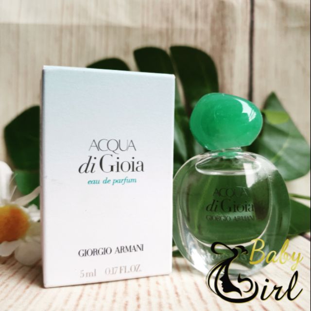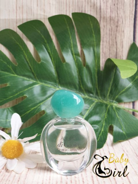 Mẫu chai Acqua di Gioia được thiết kế đơn giản nhưng đầy tinh tế và dễ nhìn. Với màu sắc xanh ngọc tạo nét nữ tính, ngọt ngào cho phái đẹp. Kết hợp với nắp chai đầu tròn xanh lục đậm tạo điểm nhấn độc đáo. Mùi hương nữ tính, ngọt ngào và đầy tươi mát với hương vị của biển dành cho phái đẹp sử dụng để bắt đầu ngày mới tăng thêm sự tự tin và lôi cuốn. Hương thơm tươi mát của mùi nước hoa có tên mang ý nghĩa là " dòng nước của niềm vui" là một sự pha trộn giữa các mùi hương tươi mát của lá bạc hà nghiền nát và chanh Limone Primo Fiore Femminello từ Calabria. Đến tầng hương giữa cấu trúc của hỗn hợp mùi hương này thúc đẩy sự chuyển hương tối đa từ hương cam quýt tươi mát đến hương hoa cỏ trong đó bao gồm hương hoa nhài trong nước, hoa mẫu đơn đẫm sương và hạt hồ tiêu hồng, trong khi tầng hương cuối khép lại bằng hương tuyết tùng, đường vàng và gỗ hồng. Sự pha trộn giữa các hương cam quýt và ngọt ngào tạo ra một hương thơm thật tươi mới, sảng khoái. Chai nước hoa này toả hương thơm gợi cảm, sang trọng và gợi cho người ta liên tưởng đến những kỳ nghỉ riêng tư bên bờ biển