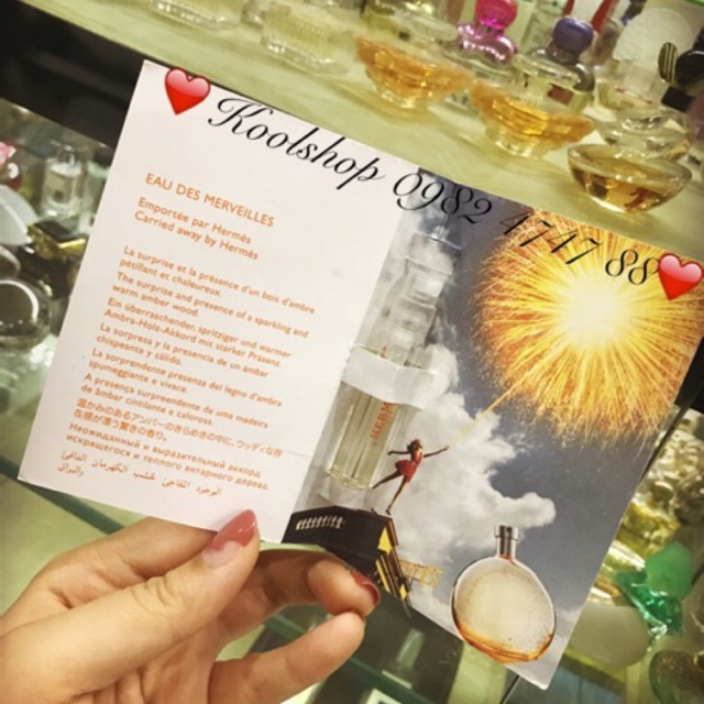 Eau des Merveilles của Hermes là chai nước hoa màu nhiệm, đầy mê hoặc, với hương thơm mang lại sự mới lạ và bất ngờ. Mùi hương Eau des Merveilles quấn quanh cơ thể như một làn sương mộng mơ, gợi cảm. Hương thơm mới lạ của hương hổ phách hòa hợp một cách tuyệt vời với hương gỗ trong lớp hương đầu, dù không có sự góp mặt của hương hoa, nhưng vẫn tạo ra thành công một mùi hương nữ tính quyến rũ. Mang các yếu tố, hương vị tuy tương phản, nhưng cũng vô cùng mật thiết và tinh tế, tạo nên hương vị hạnh phúc. Eau des Merveilles được tung ra vào năm 2004 và tạo ra bởi Ralf Schwieger và Nathalie Feisthauer. Hương thơm khởi đầu với mùi hương ấm áp của tinh chất cam và chanh và chút hương nhựa cây, nó cũng mang chút vị mặn nhưng gần như không dễ để nhận ra. Hương giữa là nơi mùi hương hổ phách tỏa hương tuyệt vời nhất, mùi hương thật sự gây ấn tượng trong suốt thời gian lớp hương này lắng xuống. Mùi hương mang chút cảm giác bột mịn, nhẹ nhàng, thoải mái, như một cái ôm ấm áp. Ngoài ra, lớp hương cũng có sự góp mặt nhẹ nhàng của nhựa cây linh sam, hòa quyện rất hài hòa với mùi hương nhựa cây trong lớp hương đầu. Lớp hương cuối là tổ hợp của cỏ hương bài, rêu sồi, tuyết tùng mang đến cảm giác thoải mái, sảng khoái. #18dangvanngu #koolshop #0982474788
