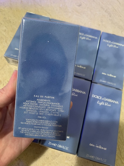 💥 D&G light blue intense nữ 25ml Hương đặc trưng Hương Đầu: chanh, Táo Granny Hương giữa: hoa lài, hoa kim cúc Hương cuối: Xạ hương. hổ phách Light Blue Eau Intense ra mắt đầu năm 2017, mang hương hoa cỏ đặc trưng nhẹ nhàng và gợi cảm. Mở đầu hương thơm phiên bản mới vẫn là thanh vị tươi mát mang vị chua nhẹ của quả xanh và táo xanh Granny kích thích khứu giác của người sử dụng để dẫn dắt đến tầng hương giữa không lâu sau đó. Nốt hương giữa cũng là nơi làm cho Eau Intense có sự khác biệt với nguyên mẫu trước là nhờ vào khu vườn hoa với hương thơm thiên nhiên được kết hợp bằng tông hoa nhài đặc trưng vốn là nguyên liệu quen thuộc của những dòng nước hoa nổi tiếng và hoa kim ngân mang phong vị ngọt quen thuộc gần giống với trái cây chín mọng. Tông hương giữa làm mùi hương trở gợi cảm và làm say mê những người xung quanh đưa lối cho họ tiếp tục chuyến phiêu lưu đến với nốt hương cuối cùng. Ở nốt hương này nhà chế tác vẫn giữ nguyên thành phần xạ hương và hổ phách là hai nguyên liệu làm nên sự ấm áp nhẹ và thơm ngát cho tổng thể mùi hương. 💥 D&G light blue intense nam 50ml Hương đặc trưng Hương đầu: cam Mandarin, bưởi. Hương giữa: hương biển, cây bách xù. Hương cuối: gỗ hổ phách, xạ hương Hương thơm của Light Blue Eau Intense phảng phất đâu đó hợp hương cooktail trái cây tươi mát hòa cùng hương quýt trong trẻo và phong vị chua nhẹ của bưởi. Nốt hương tươi mát kế tiếp sau đó, hương vị của biển hòa lẫn bách xù đầy sảng khoái và dịu nhẹ làm tâm trí người dùng phấn khích. Cuối cùng, hương thơm khuấy động khứu giác và gợi cảm bất tận bởi dấu ấn gỗ và xạ hương. #lightblue #eauintense