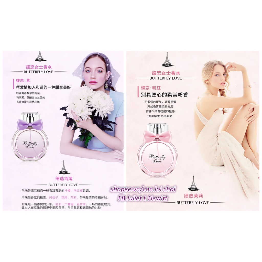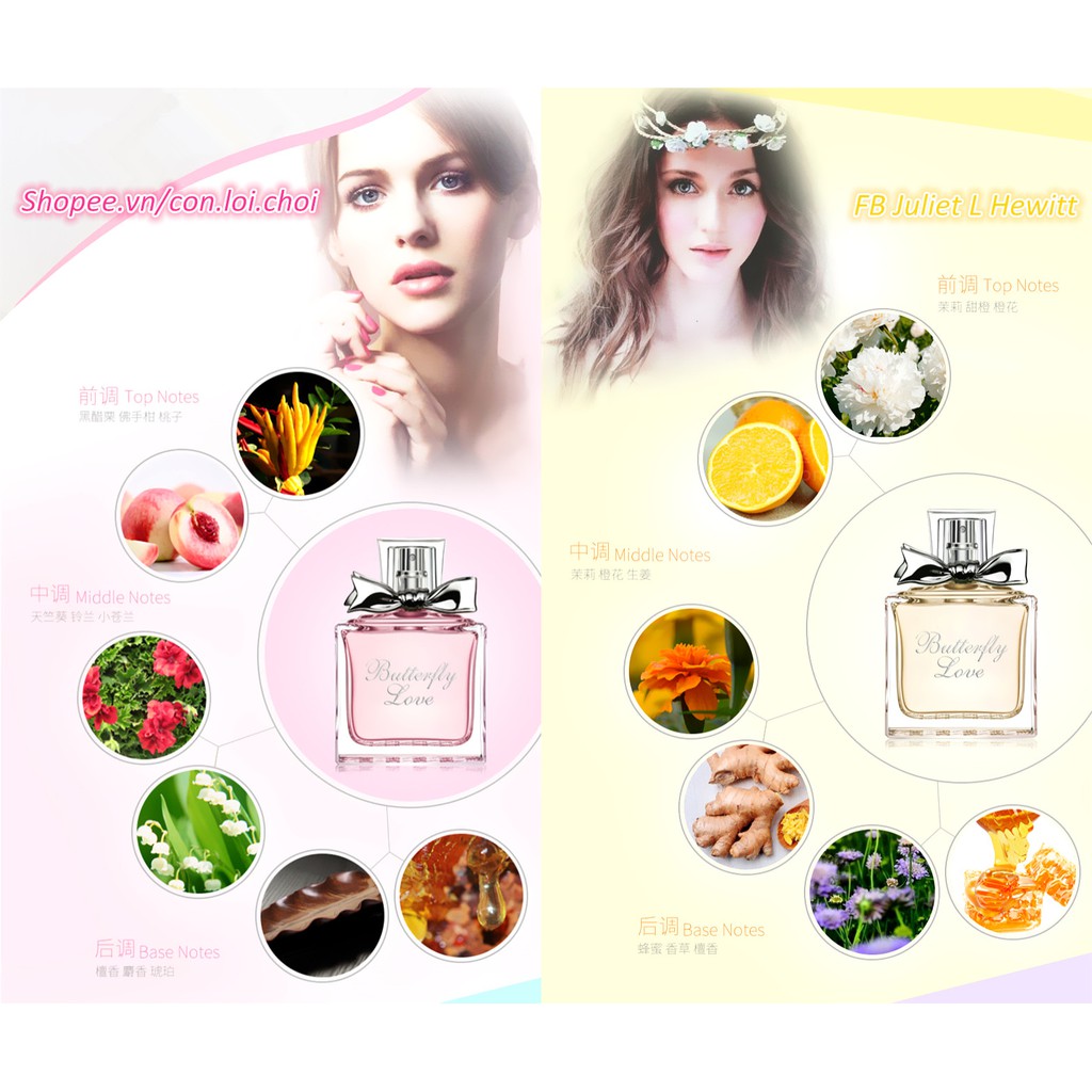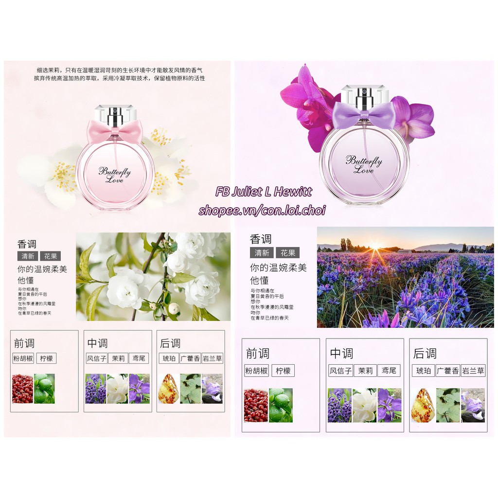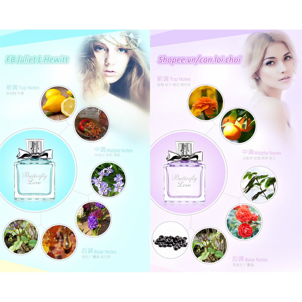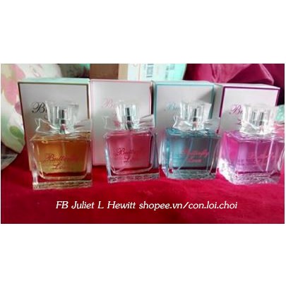 Dung tích: 50ml/chai Mùi hương tương ứng với màu như sau: 1 - Màu hồng (chai vuông): hương đầu - phật thủ, đào; hương giữa - cẩm tú cầu, hoa chuông; hương cuối - đàn hương, hổ phách. 2 - Màu xanh: hương đầu chanh và hạt tiêu hồng; hương giữa phong lan và dạ hương; hương cuối: hổ phách và cỏ ngọt; 3 - Màu vàng: hương đầu là cam và hoa nhài; hương giữa là đồng tiền và gừng; hương cuối là vani và mật ong; 4 - Màu tím (chai vuông): hương đầu là hoa đồng tiền, cam; hương giữa: hoa xấu hổ; hương cuối bạc hà và đậu hương đen. 5 - Màu tím (chai tròn) & Màu hồng (chai tròn): Hương đầu: Bột hồ tiêu, chanh; Hương giữa: Hoa Dạ Lan Hương/Phong Tín Tử (Hyacinthus orientalis), hoa nhài, hoa diên vĩ; Hương cuối: Hổ phách, Quảng hoắc hương (Pogostemon cablin (Blanco) Benth), Nham lan thảo