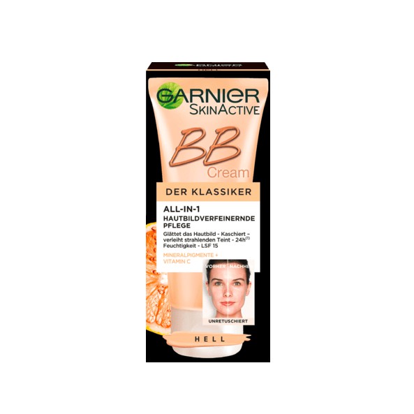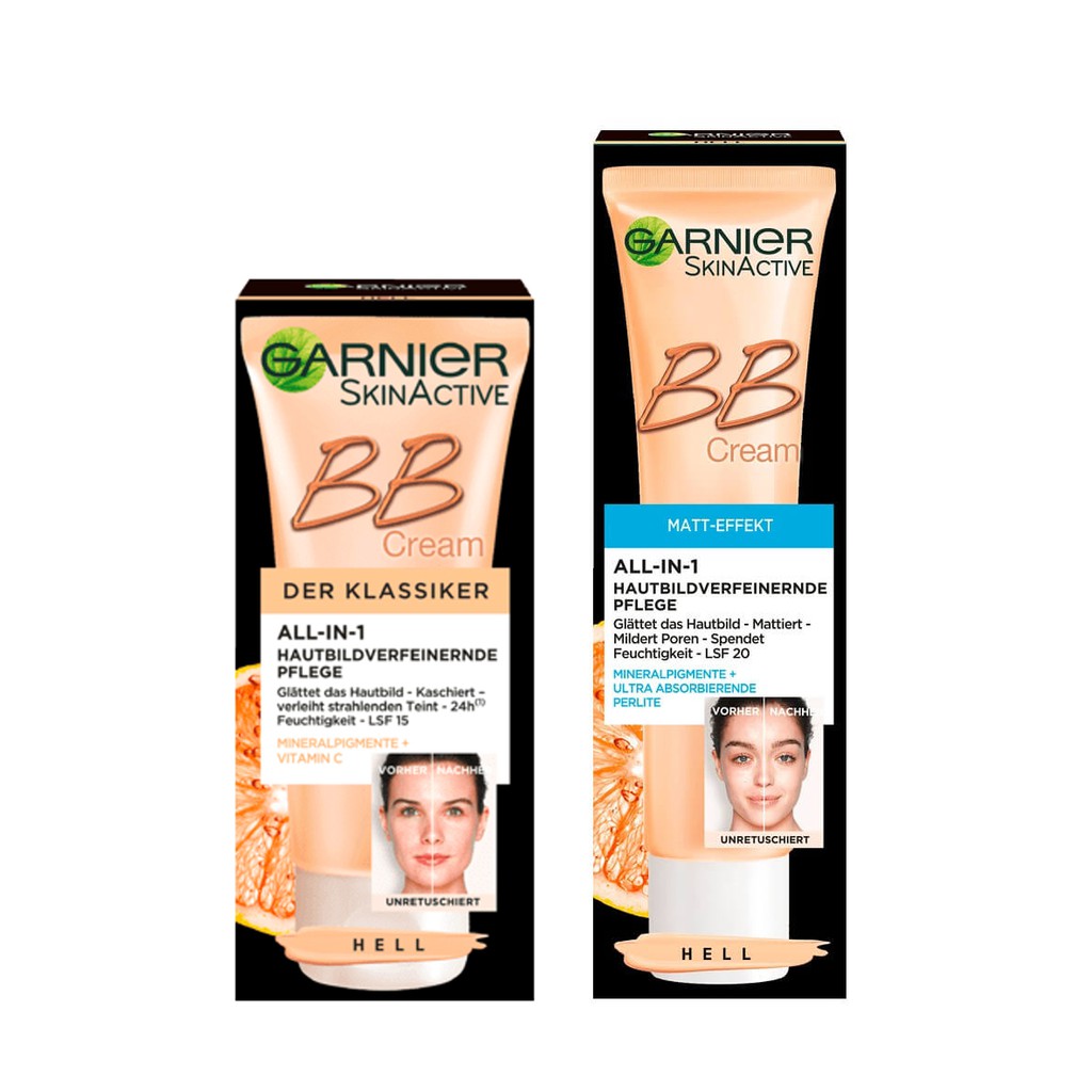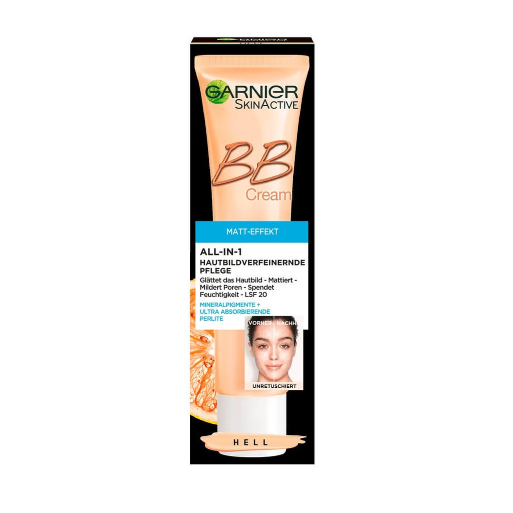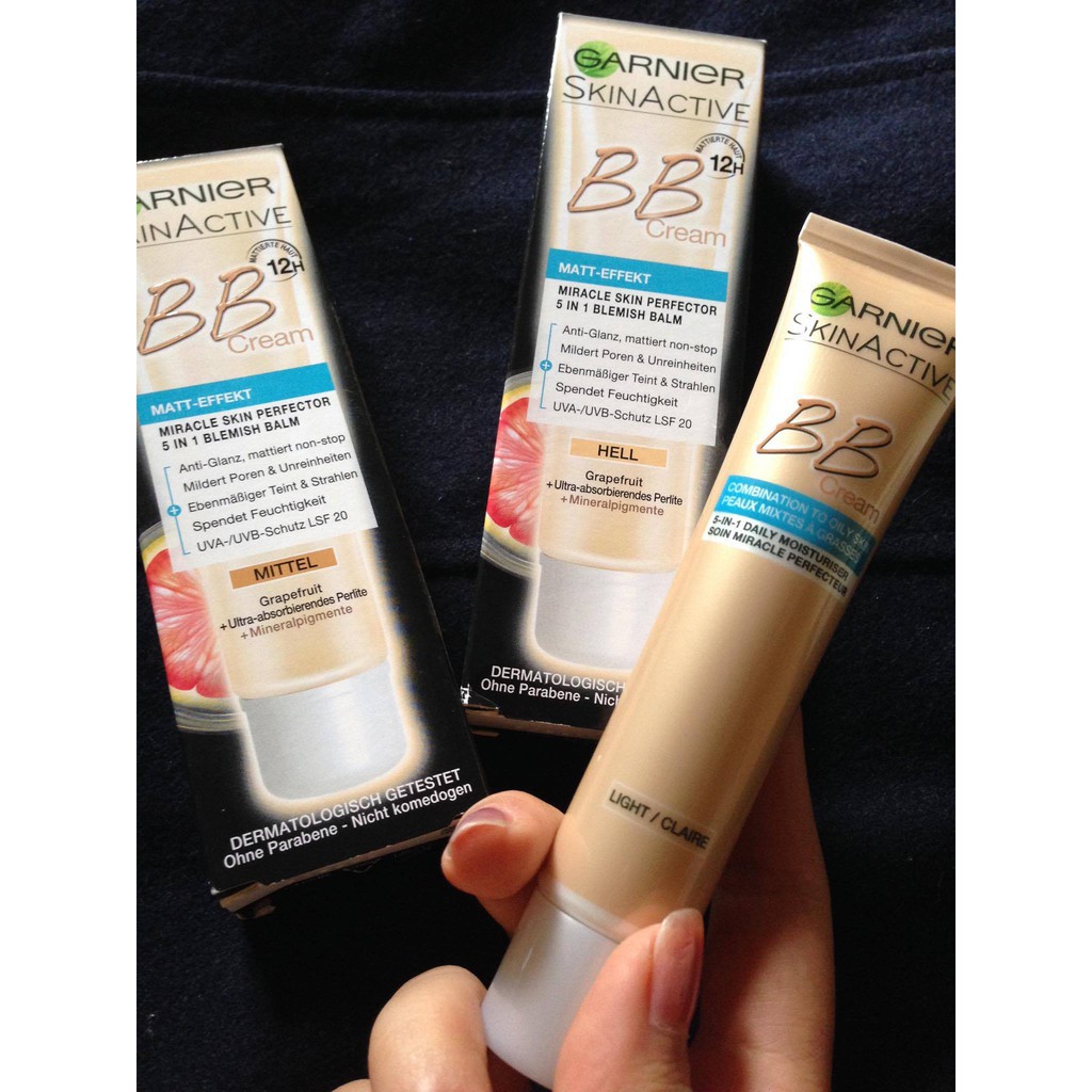 uất xứ: Pháp xuất Đức Thể tích: Chai cao, Matt - Effekt: 40ml Chai thấp, Der Klassiker: 50ml Kem nền trang điểm garnier BB Cream trở thành sản phẩm được nhiều người yêu thích nhờ đặc tính dưỡng da, bảo vệ da đồng thời là lớp nền trang điểm rất tự nhiên. 5 lợi ích của sản phẩm của kem nền Garnier BB Cream: 1. Dưỡng da ban ngày: cung cấp dưỡng chất, tăng cường độ ẩm, tái tạo lại làn da khỏe mạnh, tươi sáng. 2. Chống nắng bảo vệ da: Kem nền Garnier BB cream bảo vệ làn da trước những tác hại của tia tử ngoại, của môi trường đang rất bị ô nhiễm giúp da luôn trong sáng, mờ vết sạm nám, tăng cường phòng chống quá trình lão hóa do tác động của bên ngoài đến làn da. 3. Lót trang điểm: với tính năng của kem lót, Kem nền Garnier BB cream tạo nên sự mượt mà, mịn màng, tăng độ bám dính cho lớp trang điểm. 4.Che khuyết điểm: Kem có khả năng che phủ hoàn hảo các nếp nhăn, lỗ chân lông, các vùng da sạm đen, nám, tàn nhang. 5. Điều tiết nhờn: sản phẩm hoàn toàn Không chứa dầu (Oil free) đồng thời sử dụng Công nghệ “Foggy up Powder” hấp thụ các bã dầu thừa, cân bằng việc bài tiết dầu chống hiện tượng xuống phấn, nhờn bóng, chảy phấn đem lại một làn da mềm mại, sáng mịn trong suốt cả ngày. Sản phẩm dễ dùng, tiết kiệm thời gian, rất phù hợp với khí hậu thời tiết môi trường nóng ẩm của Việt Nam. Sử dụng: - Chai cao, Matt - Effekt: 40ml: Dùng cho da nhờn và mụn - Chai thấp, Der Klassiker: 50ml: Dùng cho da khô