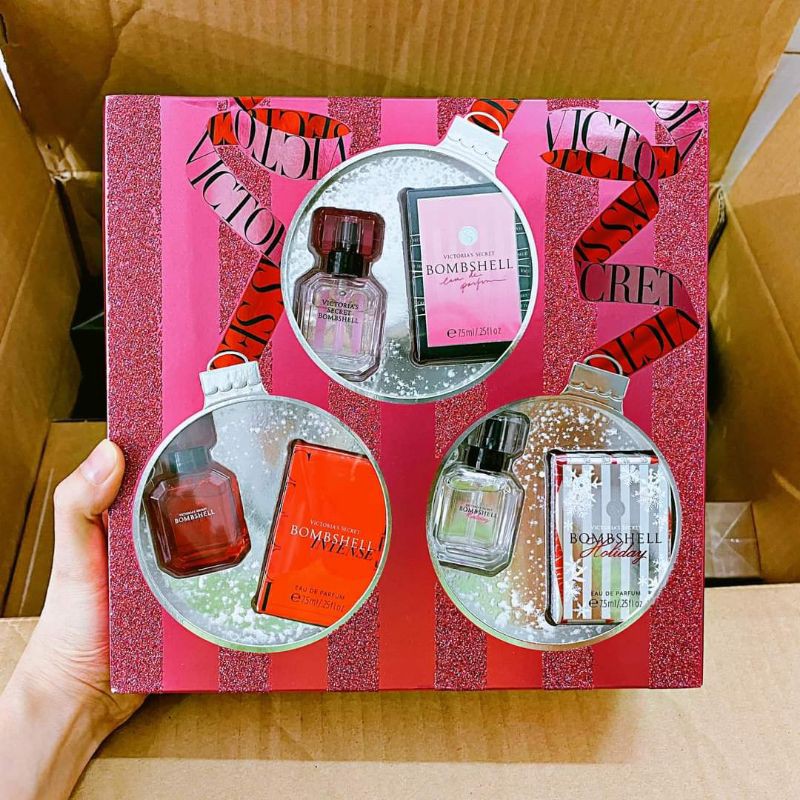 Set Nước Hoa Victoria's Secret Bombshell phiên bản giáng sinh năm nay: Bộ nước hoa xinh xắn đáng yêu, với mùi hương gợi cảm, đầy quyến rũ và khiêu khích cùng cảm xúc thăng hoa với 3 mùi nổi bật nhất của hãng. Set này rất phù hơp khi làm quà tặng trong dịp sinh nhật, hay hẹn hò. Gift set gồm 3 sản phẩm nước hoa : Victoria's Secret BOMBSHELL EDP 7.5ml Victoria's Secret BOMBSHELL INTENSE EDP 7.5 ml Victoria's Secret BOMBSHELL HOLIDAY 7.5 ml