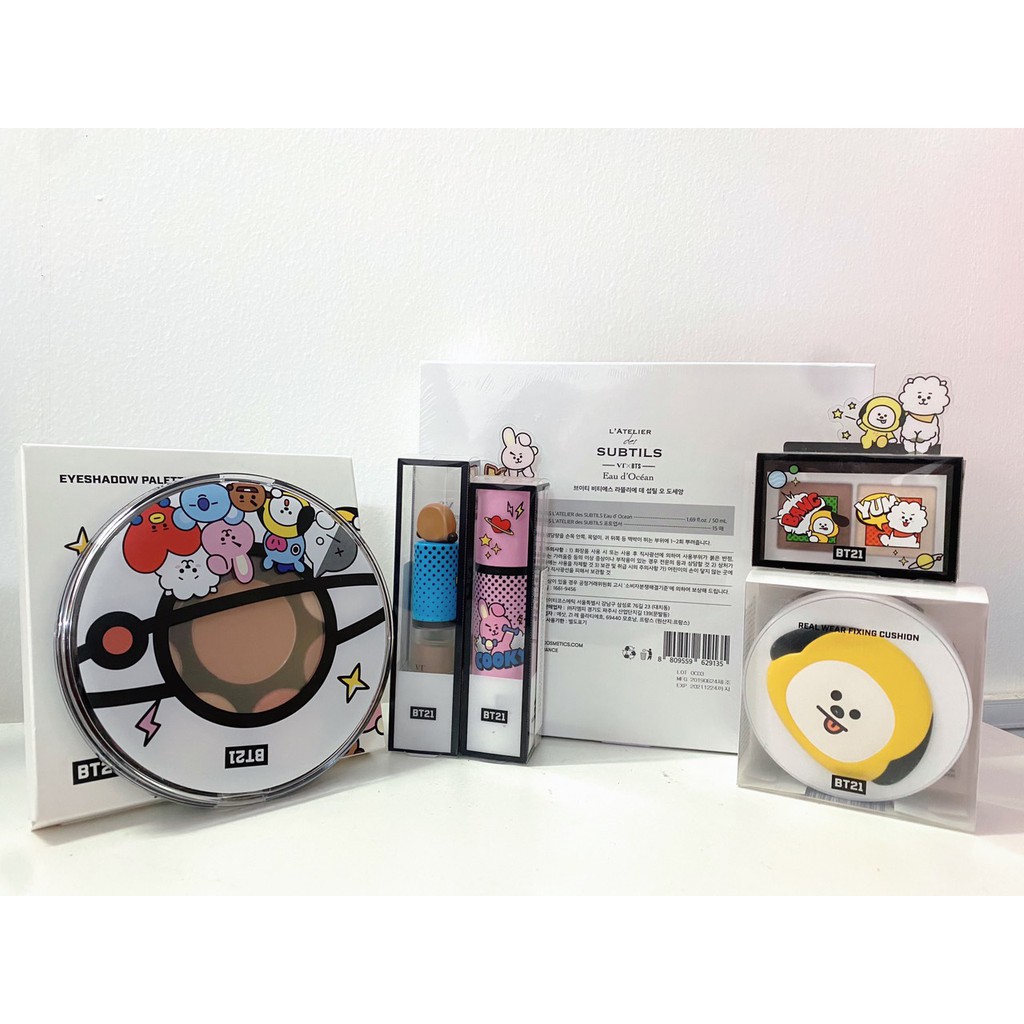 Bộ sản phẩm gồm 6 món: - Nước hoa VT x BTS: L'ATELIER des SUBTILS Eau d'Océan (Jung Kook) Eau de O'cean - hương biển cả tươi mát Được lấy cảm hứng từ mùi nước biển mát lạnh, chai nước hoa này là một mùi hương rất hoàn hảo cho mùa hè, với mùi chủ đạo là mùi giấy gỗ và nhựa thông ấm áp Dòng nước hoa không quá ngọt cũng không quá nồng vị biển này có lẽ là lựa chọn cho bất kì giới tính nào - [PHẤN NƯỚC VT X BT21] VT BT21 REAL WEAR FIXING CUSHION ( Fixing Cushion ) ☀️ SPF 50/ PA ++ 👉🏻 chống nắng và độ che phủ cao nhất trong 4loai cushion #BT21 của #VTcosmetics , độ che phủ và kiêm dầu cũng best nhất luôn 😍, lớp nền lâu trôi với độ #matte ổn định 😘 - [PHẤN MẮT NHIỀU MÀU] VT ART IN MULTI EYE SHADOW - [BẢNG MÀU MẮT VT BT21] VT BT21 EYESHADOW PALETTE - KEM NỀN TRANG ĐIỂM VT ART IN STICK FOUNDATION Có 4 tone màu cho bạn lựa chọn. - RJ : 18 pure beige - Cooky : 21 Light beige - Mang : 22 Medium beige - Koya : 23 Natural beige