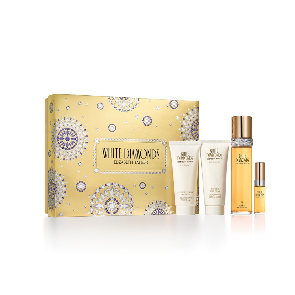 Kỷ niệm sự quyến rũ của Elizabeth Taylor với hương thơm Kim cương trắng vượt thời gian của cô. Đối với người phụ nữ cổ điển và sành điệu, White Diamonds là một hương thơm phong phú và sang trọng với sự rực rỡ vô tận của một viên ngọc quý hiếm. Đó là mẫu mực của chất lượng ngôi sao Elizabeth: rạng rỡ, quyến rũ, đẹp mê hồn. White Diamonds là một mùi hương hoa gợi cảm, làm say đắm người đeo nó với sự quyến rũ và lấp lánh của bộ sưu tập trang sức kim cương nổi tiếng thế giới của cô. Hương giữa bao gồm: Hoa huệ, Hoa nhài sống và Hoa hồng Narcissi sống. Hương cuối cùng bao gồm: Amber, Oakmoss. Hoắc hương và gỗ đàn hương Mysore. Bộ gồm 1 nước hoa 100 ml 1 nước hoa 15 ml 1 dưỡng thể 50 ml 1 sữa tắm 50ml