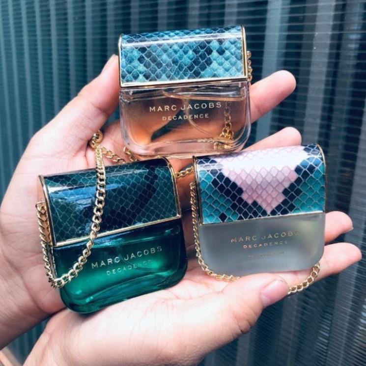 Bộ 3 Chai Nước Hoa Nữ Marc Jacob DecadenceBộ Nước Hoa y hình. Gồm 3 chai. Mỗi chai 25ml dạng xịt. Bao thơm bao dai mùi cực sang trọng khỏi bàn nha. Em nào cũng Hot. Lại xinh xắn làm quà tặng cực sang. Decadence lại quyến rũ và tinh tế. Thiết kế chai mang hình dáng như chiếc bùa hộ thân của nhà thiết kế, đây còn là biểu tượng của sự dồi dào và nét lộng lẫy cao sang. Tái hiện hình ảnh một chiếc ví cầm tay mang màu xanh của ngọc lục bảo kết hợp cùng họa tiết da rắn lặp lại trên nắp chai, đi cùng dây xích vàng và nắp túi màu đen.