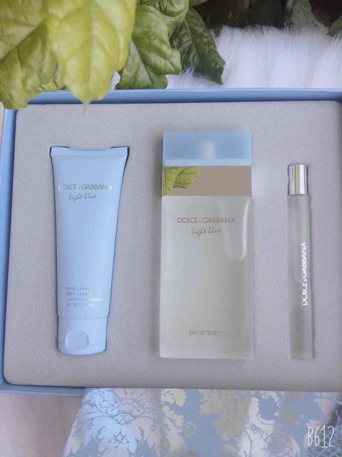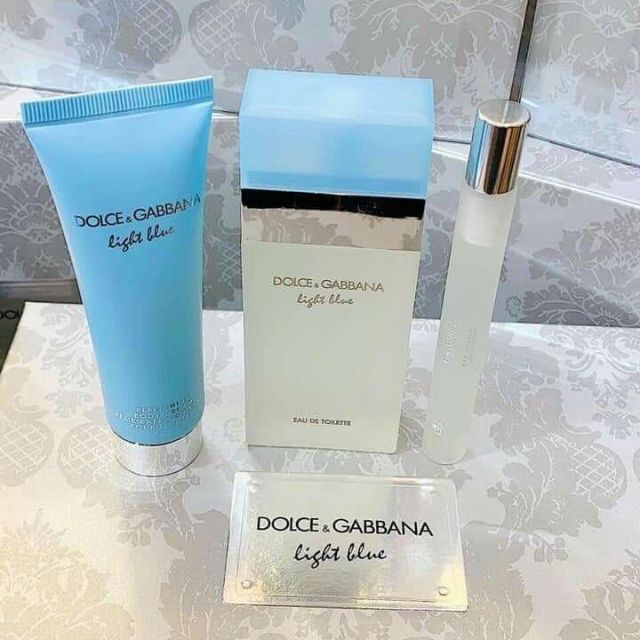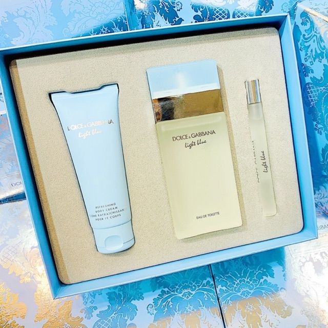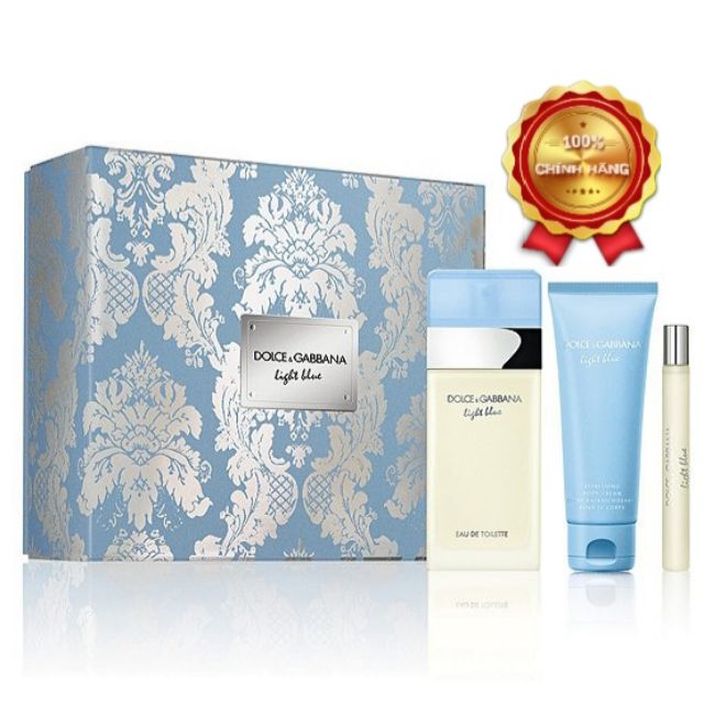 Set nước hoa nữ Dolce & Gabbana Light Blue EDT Bộ quà tặng gồm: + Nước hoa nữ Dolce & Gabbana Light Blue EDT 100ML + Sữa dưỡng thể Dolce & Gabbana Light Blue 75ML + Nước hoa Dolce & Gabbana Light Blue EDT 10ML