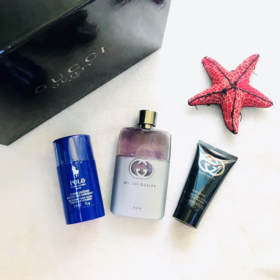 SET GUCCI GUILTY EAU Gồm: - Chai nước hoa Gucci Guilty90ml - Chai sữa tắm gội 50ml - Chai lăn khử mùi Polo Blue 75ml (Polo Blue là một món quà từ Ralph Lauren muốn gửi tới những chàng trai trẻ năng động, tự tin, yêu tự do và luôn tràn đầy năng lượng sống. Một hương thơm lí tưởng cho mùa hè và những lúc bạn cần “lên dây cót” cho tinh thần mình. Khởi đầu với hương dưa lưới Cavaillon, quýt đỏ và dưa leo tươi mát không ngờ, Polo Blue tiếp tục làm bạn phấn chấn hơn với tầng hương giữa gồm phong lữ, húng quế và ngải đắng thể hiện sự nam tính; cuối cùng là tầng hương êm dịu của gỗ thơm, xạ hương và da lộn Thuỵ Điển. ) Mùi hương đặc trưng: - Hương đầu: Chanh, cam Bergamot. - Hương giữa: Gỗ orris, hoa cam. - Hương cuối: Hoắc hương, xạ hương. Phong cách: Tinh tế, mạnh mẽ, thanh lịch. ================= Ship hàng toàn quốc. CUNG CẤP SỈ & LẺ NƯỚC HOA, MỸ PHẨM, THỰC PHẨM CHỨC NĂNG NHẬN ORDER HÀNG MỸ - ÚC - NHẬT - ANH Website: Pazu.vn Hotline: 0939.658.608 Add: 448/1 Trần Hưng Đạo, P.2, Q.5, Tp.HCM