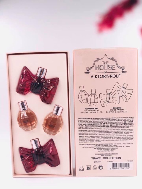 ☘☘Set Nước Hoa Nữ Mini Viktor & Rolf 4 Piece 🌹Flowerbomb Edp - 2 x 7ml: Flowerbomb Viktor & Rolf là loại nước hoa tuyệt vời dành cho các bạn gái. “Cho dù bạn đơn giản như thế nào thì đây là cách bạn có thể gây ấn tượng sâu đậm với người đàn ông của mình”. Mùi hương của nó rất đáng yêu, không thể cưỡng lại được với hương nồng nàn của hoa nhài, nhẹ nhàng hoa lan, sâu lắng của hoắc hương. 🌹Bon Bon Edp - 2 x 7ml: Nước hoa Bonbon mời gọi xúc cảm vô tận của vẻ đẹp thanh khiết và sự theo đuổi những khoái cảm tuyệt vời. Bonbon khoác lên người phụ nữ câu chuyện về chính mình: quyền lực, xinh đẹp và hoàn hảo.