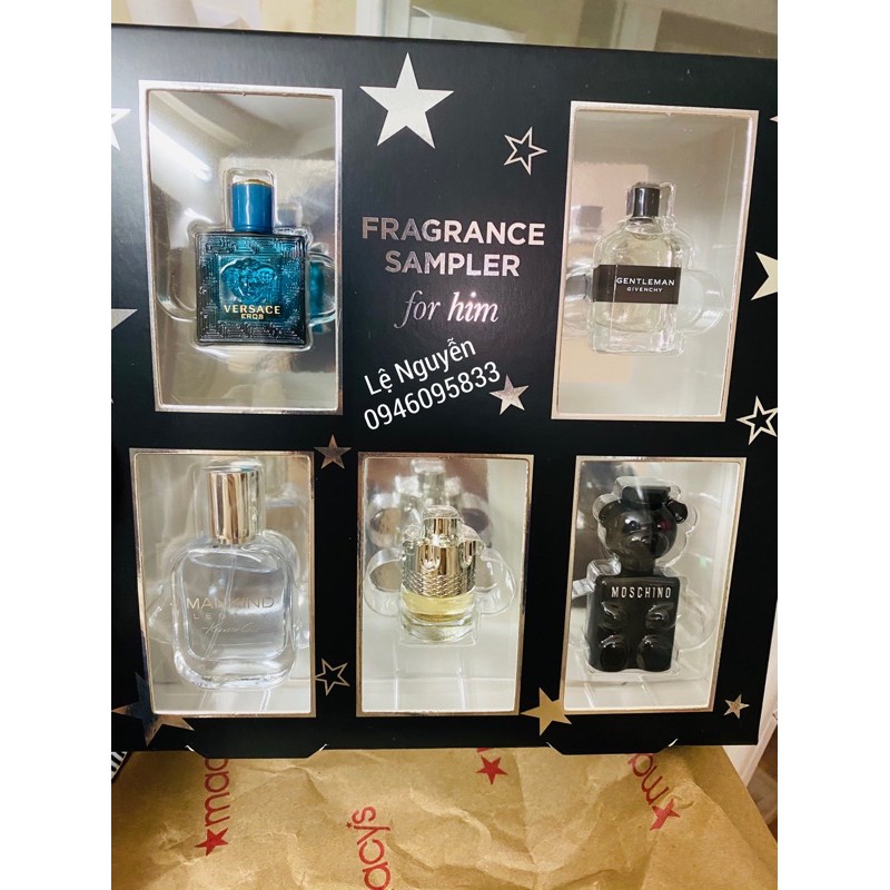 mùi hương sang trọng yêu thích của bạn dường như chưa bao giờ đơn giản như vậy. Được tạo ra cho Macy's, bộ lấy mẫu này được thiết kế đặc biệt cho người đàn ông là hiện thân của sự thay đổi. Khám phá một sở thích mới và thay đổi mùi hương của bạn. BỘ QUÀ TẶNG BAO GỒM: Azzaro Wanted Eau de Toilette, 0,1-oz. Givenchy Gentleman Eau de Toilette, 0,2-oz. Kenneth Cole Mankind Legacy Eau de Toilette, 0,5 oz. Moschino Toy Boy Eau de Parfum, 0,17-oz. Versace Eros Eau de Toilette, 0,17-oz.
