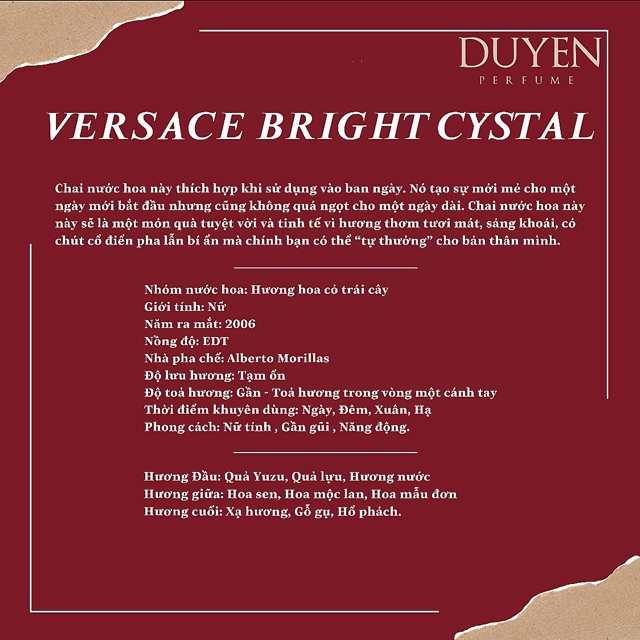 Mùi của tự do các cậu ạ! Bright Crystal là một trong những chai nước hoa mà tớ yêu da diết. Giống như một cô gái cảm nắng một chàng trai thì trong lòng chỉ có người đó, chai nước nhỏ xinh màu hồng ấy cũng chiếm đoạt trái tim tớ như thế. Nhớ lại buổi đầu gặp nhau của chúng tớ là lần dạo qua quầy nước hoa của trung tâm thương mại. Giữa hàng trăm lọ nước hoa bắt mắt khác, em ý đã thu hút tớ bởi cái vẻ ngời sáng, sang trọng và thanh lịch, trong suốt để ta thấy được thứ chất lỏng màu hồng nhạt bên trong là điểm tinh tế nhất đã thu hút hàng ngàn cô gái. Phụ nữ ấy mà, ai chả vậy, thích những thứ xinh đẹp và lãng mạn, một chai nước hoa quyến rũ như thế tớ làm sao cưỡng lại được chứ!!! Thứ chất lỏng mầu hồng trong khối kim cương kia có phải là thứ bạn đang cần không? Ngọt nhẹ nhàng ve vuốt, không phải là cô gái bốc lửa đâu nhé. Vị ngọt man mát của lựu đỏ trượt dài cùng hương nõn nà e ấp của sen. Chỉ hơi tiếc là Bright chỉ như gió thoáng qua, lâu một chút bạn sẽ cảm được cả mùi hồng. Những cô gái đang ngượng ngùng chắc sẽ cần Bright Crystal tỏ lời thay. ——————————————————— ◾️ 𝐂𝐥𝐢𝐜𝐤 "𝐛𝐮𝐲 𝐧𝐨𝐰" 📍 𝐁𝐚𝐬𝐞𝐝 𝐈𝐧 𝐇𝐂𝐌 𝐈𝐠: @𝐝𝐮𝐲𝐞𝐧𝐩𝐞𝐫𝐟𝐮𝐦𝐞