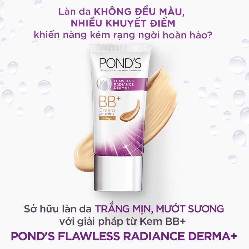 Bạn đang tìm kiếm một loại kem nền che phủ tốt và vẫn dưỡng trắng? - Viện nghiên cứu Pond’s tự hào giới thiệu dòng sản phẩm dưỡng trắng tạo nền kem BB - Pond’s Flawless Radiance Derma+. - Chất kem mịn, che phủ ngay những khuyết điểm trên da như thâm nám, vết thâm quầng, da xỉn màu mà không gây nhờn rít hay bết dính, giúp da đều màu và sáng lên tức thì. Đồng thời, công thức GenActiv giúp dưỡng trắng từ sâu bên trong. - Cho một làn da trắng đẹp rạng ngời, hãy sử dụng trọn bộ sản phẩm Pond’s Flawless Radiance Derma+, để có hiệu quả dưỡng trắng tốt nhất Hướng dẫn sử dụng Sau khi bôi kem dưỡng da ban ngày, cho một lượng vừa đủ kem BB lên mặt ngón tay (trung bình lấy khoảng một hạt đậu, lượng kem có thể gia giảm tùy theo màu da) Chấm kem thành nhiều đốm nhỏ đều khắp mặt. Nhẹ nhàng thoa đều kem BB trên mặt theo hướng từ trong ra ngoài, bắt đầu từ vùng trán đến vùng má và vùng cằm Chấm thêm kem BB trực tiếp lên những khuyết điểm trên da và những vùng da đậm màu để có hiệu quả che phủ tốt hơn HSD: 3 NĂM KỂ TỪ NSX Xuất xứ: indo