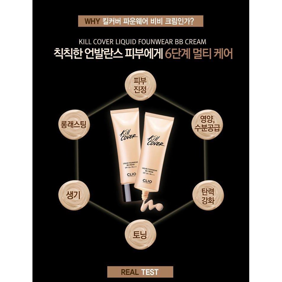 BB cream KILL COVER SPF50+ PA+++ (50ml) •Thương hiệu: CLIO •Xuất xứ: Hàn Quốc Che phủ bền lâu + bám fit mỏng mịn = Lớp nền hoàn hảo không tì vết! [BB Cream đa tính năng: Chống UV + Làm trắng + Chống nếp nhăn] ❤ Đây là BB Cream mới của Clio - nằm trong dòng sản phẩm make up nền Kill Cover nổi tiếng, với khả năng che phủ bền bỉ cho da và có độ bám da chặt chẽ cho bạn một lớp nền mỏng mịn, tự nhiên. ❤ Đầu tiên, đây là một BB Cream lỏng (Liquid) nên nó dàn trải rất đều trên da, dành cho những ai mới tập make up - những cô gái chưa làm quen với cọ hay mút tán kem gì vẫn có thể dùng đầu ngón tay mình để tán BB Cream một cách dễ dàng. Nó dễ dàng bao phủ đều mịn mà không xảy ra hiện tượng bết trên da. ❤ Fitting Cover - lớp kem bám sát da và tăng độ láng mịn cho bề mặt. ❤ Chứa 40% thành phần dưỡng ẩm giúp cấp nước và sức sống cho da khi bạn make up, làm lớp nền trông sáng khỏe ẩm mượt hơn. ❤ Ngoài khả năng che phủ cao thì Bb Cream này còn làm sáng tone da của bạn