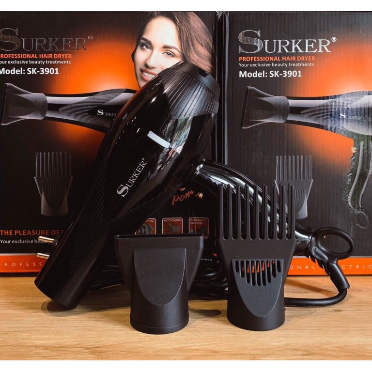 Máy sấy tóc Surker SK-3901 phân khúc tầm trung hàng xịn Có chức năng Ion âm giúp bảo vệ không bị khô xơ cho tóc. Thiết kể hiện đại, đẹp, sang trọng Công suất lên tới 3000wsd Có 2 mức độ gió và 3 mức điều chỉnh nhiệt (từ lạnh đến nóng) phù hợp với mọi nhu cầu Có 2 đầu sấy đa năng, 1 đầu hội tụ gió và 1 đầu phân tản gió