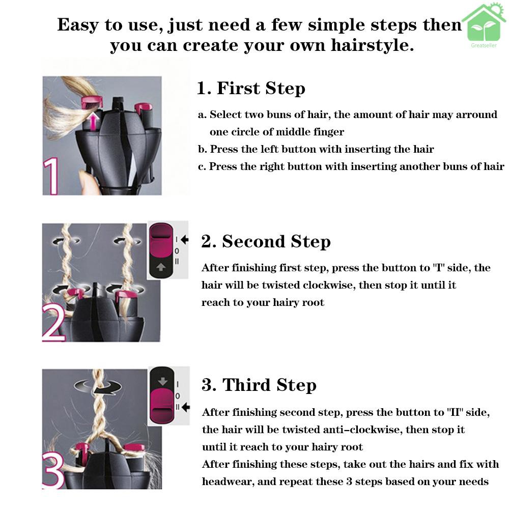Thank you for your support, please read the following carefully before purchasing:This is a new fashionable automatic hair braiding tool, which can help you create your own hairstyle just with a few simple steps, very convenient to use. Suitable for any hair type, such as straight hair, curly hair, thick or thin hair. It can help you easily and quickly weave any type of hairstyle. Features: Completely automatic and convenient hair braiding tool, very useful for twisting hair quickly and easily. 360 degree rotation, built-in sensitive detection device to prevent the hair stuck, which will not injure your hair, safe to use. Very easy and comfortable to use, one-click control, just need a few simple steps then you can create your own hairstyle. Powered by 2*AA batterys(not included) or powered by USB cable, providing you continuous Power to twist your hair. Suitable for DIY use, a perfect hair styling tool in your daily life, saving your time and money. Specifications: Material: ABS+Electronic Components Power: 25W-39W Powered by: 2*AA Batterys(Not Included) or USB Cable Item Size: 220 * 80mm / 8.66 * 3.15in Package Size: 220 * 80 * 40mm / 8.66 * 3.15 * 1.57in Package Weight: 190g / 6.70ounce Packing List: 1 * Automatic Hair Braid Tool 1 * USB Cable 1 * User Manual(English)