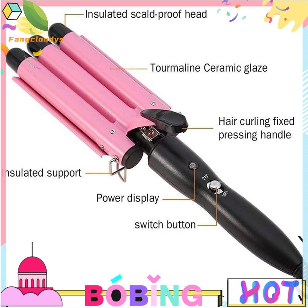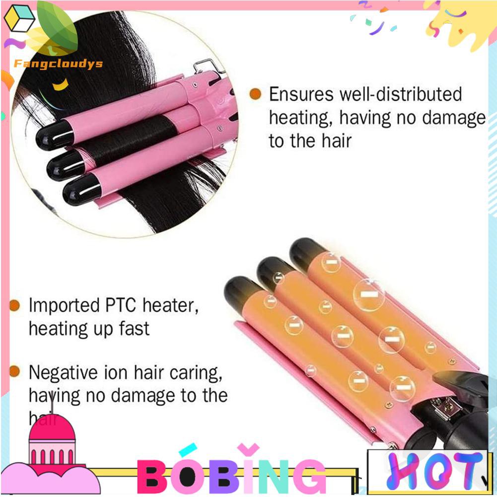 Durable Pro Triple Barrel Hair Curler Curling Iron Perm Splint Hair Styling Tool Egg Roll Hairstyle Practical Electric Hair Roller for Salon Home UK Feature: -Natural curl - 3 barrel ceramic curler is an excellent tool to create natural and elegant curls all day long. You can easily change the appearance. -Fast heating - this three cylinder curler can rise from 0 to 410 °F (210 °C) in only 120 seconds. Adjust the temperature of the fast heating 3-barrel wand to suit your hairstyle. In just a few minutes, you can have a stylish look. -Hair protector - the imported ceramic glaze coating technology can make your hair more uniform, more healthy, and protect your hair. -For all types of hair - whether your curls are long or short, thick or thin, this hair curler with three hair boxes is just as charming. Heated ceramics produce negatively charged ions, which produce soft, shiny waves. Curlers can help you curl your hair easily and safely at home. Specification: Temperature-controlled adjustment: multi-gear temperature-control Power: 70-130W Voltage: 110 V to 240 V Temperature: 180-210 °C Thermal conductivity material: environmental protection alloy Suitable for hair: for wet and dry Product color: Pink, Gold Product size: 37*8.5*8.5cm / 14.6*3.3*3.3in Note: Due to the different monitor and light effect, the actual color of the item might be slightly different from the color showed on the pictures. Thank you! Please allow 1-3mm measuring deviation due to manual measurement. Included: 1 X Triple Barrel Hair Curler