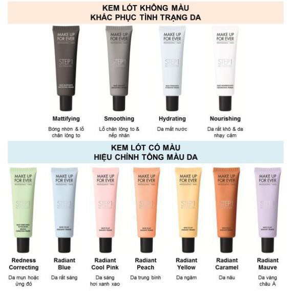 MAKE UP FOR EVER - Kem Lót Step 1 Skin Equalizer Primer 🔥 Lời hứa của Make Up For Ever- Bán hàng vì chữ tâm- vì vẻ đẹp của người phụ nữ Việt 🔥 ✅Sản phẩm cam kết 100% chính hãng từ công ty Make Up For Ever ✅Uy tín thương hiệu được khẳng định, đảm bảo qua hàng vạn đơn hàng đã đến tay khách hàng trên toàn quốc và hàng triệu sản phẩm được trưng bày trong các trung tâm thương mại lớn khắp cả nước ✅Hàng Có Sẵn SỐ LƯỢNG LỚN TRÊN TOÀN QUỐC ✅SHIP LUÔN VÀ NGAY - SHIP COD TOÀN QUỐC ✅TUYỂN SỈ- ĐẠI LÝ- CHI NHÁNH TRÊN TOÀN QUỐC ☎Sdt/Zalo:0888.71.71.71-0988.67.47.42 ---------------------------------------------------- Xuất xứ: Pháp Đặc điểm nổi bật - Giúp cải thiện khuyết điểm da không đều màu. - Giúp lớp nền lên màu đẹp hơn, giữ lớp trang điểm bền lâu suốt cả ngày dài. - Giữ ẩm tốt cho da, hạn chế tình trạng lớp nền bị khô. - Chất kem siêu mịn, dễ dàng tán đều vào da mà không gây bết dính hay để lại vệt kem. Nếu bạn đang muốn lớp trang điểm của mình trở nên mịn màng tự nhiên, bền lâu suốt cả ngày dài thì hãy khám phá ngay siêu phẩm kem lót Make Up Forever Step1 Skin Equalizer Primer. Dòng kem lót STEP 1 SKIN EQUALIZER PRIMER có 11 loại, gồm 4 loại không màu giúp khắc phục tình trạng da và 7 loại có màu giúp hiệu chỉnh tông màu da. Bạn chọn loại nào cho làn da của mình? Các loại STEP 1 trong ảnh theo thứ tự từ trái sang: #1 Mattifying Primer: cho da bóng nhờn & lỗ chân lông to #2 Smoothing Primer: cho da có lỗ chân lông to và nếp nhăn #3 Hydrating Primer: cho da mất nước #4 Nourishing Primer: cho da khô và bong tróc hoặc da nhạy cảm #5 Redness Correcting Primer: cho da mụn và ửng đỏ #6 - #11: Radiant Primer: cho da không đều màu hoặc xỉn màu, với nhiều tông màu dành cho tất cả sắc da trên Thế giới HƯỚNG DẪN SỬ DỤNG: - Sau khi rửa sạch mặt, bạn sử dụng kem lót Make Up Forever Step 1 Skin Equalizer No.5 trước khi đánh phấn nền. Nếu cần sử dụng kem che khuyết điểm, bạn nên thoa kem dọc mũi hay cằm, vùng da dưới mắt. - Lấy lượng kem lót vừa đủ, chấm lên năm trọng tâm của vùng mặt và dùng tay massage đều khắp mặt. Bạn nên thoa kỹ kem vào những cùng da không đều màu, sản phẩm Step 1 Make Up Forever sẽ giúp da lên tông màu sáng rất tự nhiên.