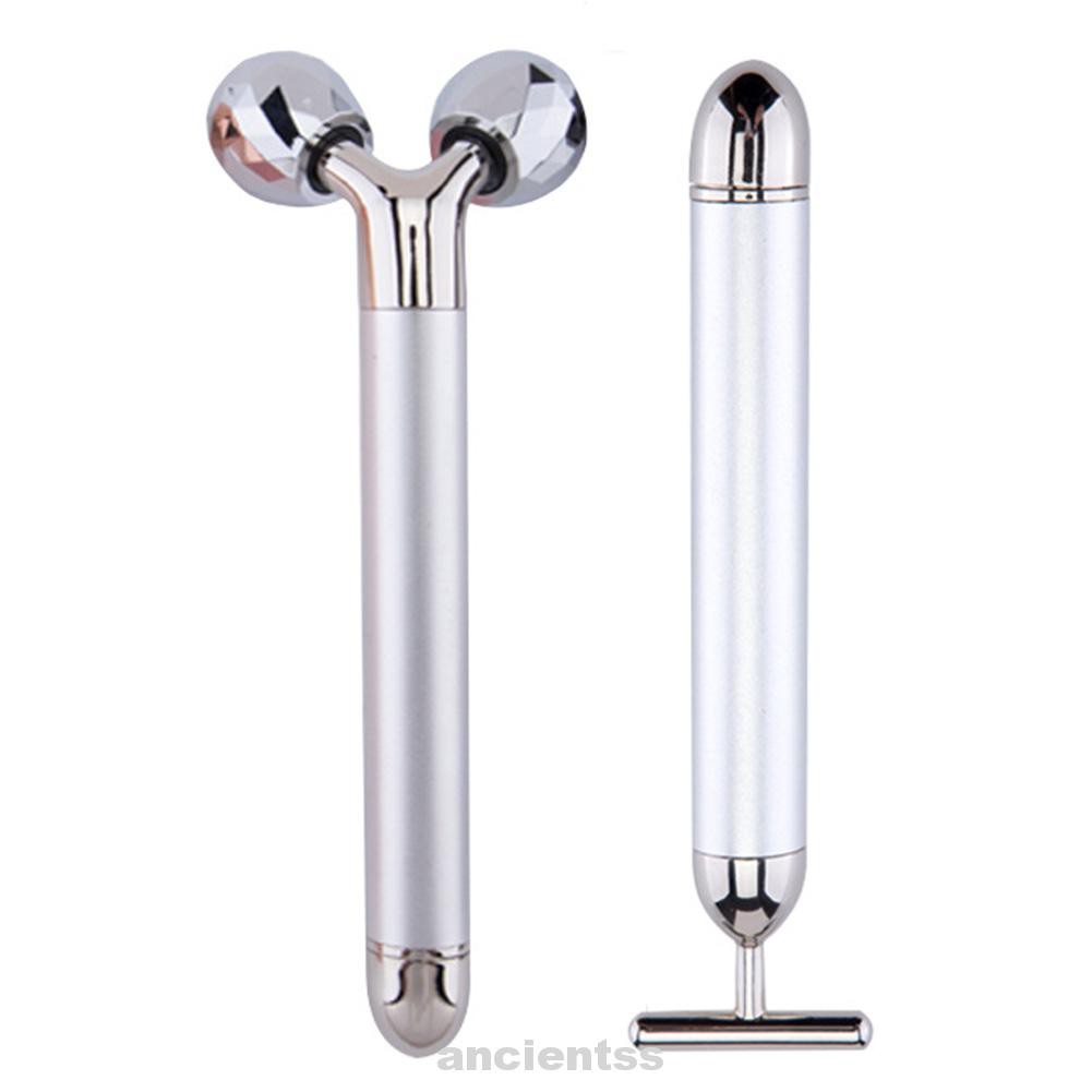 Description: 2-IN-1 MULTIFUNCTION: With two types of bar. One is 3D roller face massager. The other is T shape electric energy beauty bar. Enjoy your skin care time with them. DESIGN: 3D electric sonic energy bar is so wonderful with surface diamond-grade cut small diamond shape. And V type design to fit the whole body tighting curve. T shape head is designed for 6000 vibrations per/min and is good at tightening skin. FUNCTIONS: Daily use of the beauty bar will make your face and skin look healthier and younger by reducing wrinkles and removing dark circles. Moreover, it will increase skin metabolism through stimulating your blood circulation. Also, it can combine with skin care products and promote better absorption. WATERPROFF DESIGN: You can enjoy it while showering due to the special 360 degree waterproof design. PORTABLE: What's more, you can use the electric massager whenever and wherever because of its portable design. Specification: Material: Zinc alloy + aluminum + ABS Color: Gold, Rose Gold, Black, Silver Length: About 15.5cm Powered by: 1pc x AA battery (not included) Quantity: 2pcs/set Package includes: 2pcs x Face Massager Roller Note: -Due to the light and screen difference, the item's color may be slightly different from the pictures. -Please allow 1-2 cm differences due to manual measurement.