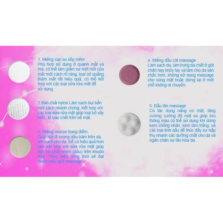 Thông Tin Sản Phẩm Máy Massage Rửa Mặt 5 In 1: + Tên sản phẩm: Máy Massage Rửa Mặt 5 In 1 Beauty Care Massager + Mode: AE-8782 + Xuất xứ: Đài Loan + Trọng lượng: 300 gram + Kích thước: 13cm*6.5cm*4.5cm + Pin: 2 pin AA + Màu sắc: hồng + Bộ sản phẩm bao gồm 5 đầu massage rửa mặt Điểm Nổi Bật Của Máy Massage Rửa Mặt 5 In 1: – Máy rửa mặt 5 in 1 Beauty Care Massager giúp bạn chăm sóc da một cách toàn diện và hiệu quả ngay tại nhà, giúp tiết kiệm tối đa thời gian quý giá của bạn. Làn da của bạn sẽ được chăm sóc toàn diện: loại bỏ nếp nhăn, loại bỏ lớp biểu bì chết, ngăn ngừa dầu và tăng cường hấp thu độ ẩm cho da, hỗ trợ tẩy trang hiệu quả. – Được thiết kế nhỏ gọn xinh xắn và rất dễ sử dụng, cho phép bạn có thể massage mọi lúc mọi nơi và linh hoạt hơn trong quá trình sử dụng. Máy rửa mặt và massage với 5 loại, giúp bạn massage da mặt, vành tai, ngực, khuỷu chân, tay hiệu quả. – Máy rửa mặt 5 in 1 được thiết kế bằng chất liệu nhựa mang tới độ an toàn tuyệt đối và thân thiện hơn với người sử dụng.Chất liệu nhựa an toàn, không gây hại và làm dị ứng cho da. – Máy rửa mặt 5 trong 1 có hai nấc điều chỉnh để bạn điều chỉnh mức độ nhanh chậm phù hợp. – Tiện sử dụng ở mọi nơi, tiết kiệm thời gian và chi phí.