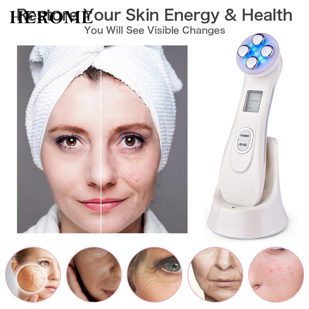 0159329435550558 herome Facial Firming Care EMS Face Lifting 5 in1 Portable For Skin Care Skin Toning Machine 5 in1 Novel Description: 100% Brand New and High quality. 6 Ligh Color Mode – Red, green, blue, yellow, pink, flashing pink. activate deep cells and make skin metabolize better. Combine with 5 levels of intensity, fit for all kinds of skin. Enhance the absorption of skin care products, whitening skin. Improve dull skin tone, lighten skin. It helps the skin to tighten, maintain elasticity, prevent allergies and other problems. Face massage use EMS to stimulate face muscle and firm skin, delivering an excellent results of lifting and tightening skin. Moisturizers and lotions are encouraged to be used with this device as the device can increase their efficiency and provide for smoother operation of the device. The face toning machine is good for the whole face areas and body massaging.Specification: Material:ABS. Color:White. Size:16.5*4.5cm(Not Included Charging Stand) Input:DC 5V 500mA. Battery Capacity:450mAh. Power:Max 10W. Charging Time:2hrs. Using Time:10mins/time. LED Light Color: Red light: Removal wrinkle skin. Green light: Treat dark spots or discolored skin. Blue light: Treat Acne and oily skin. Yellow light: Brighten the skin. Pink Light: Whiten the skin. Pink flash light: Aid in the permeation of skin care product. Technology:EMS(Electrical Muscle Stimulation), Mesoporation, Electroporation, RF( Radio Frequency), LED.Note: -Please allow 1-2cm error due to manual measurement. Please make sure you do not mind before you bid. -The colors may be different as the difference display. Please understand. -Please read all safety instruction to use this device. -Keep out of reach of the children.Package Included: 1 x Skin Tightening Machine. 1xUSB Cable. 1x User Manual. 1x Charging Stand.