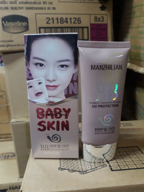 Xuất xứ : Hàn quốc Dung tích : 40gr Kem BB cream Baby Skin tinh chất ốc sên trắng mịn. Chiết xuất ốc sên giúp tái tạo và chống lão hóa da một cách hiệu quả nhất. Khoáng chất thiên nhiên, chiết xuất ốc sên và nhiều tinh chất thảo dược giúp da mịn và tươi sang. Màu sắc tự nhiên giống da thật, không để lộ lớp phấn trang điểm dung như một sản phẩm lót trong Make –up chuyên nghiệp. Cách dùng: Dùng trang điểm nhẹ và dưỡng da như một chế phẩm dưỡng da. Kem BB cream Baby Skin tinh chất ốc sên trắng mịn là sự tổng hợp chức năng kem lót và kem nền. Đồng thời sản phẩm có hiệu quả ngăn ngừa nếp nhăn, làm mờ các vết nám và các vết thâm, tạo cảm giác làn da mềm. Với khả năng bám dính cao, đem lại làn da láng mượt tự nhiên như không trang điểm. Sản phẩm nhẹ nhàng, tiện lợi, phù hợp với những khách hàng thích trang điểm tự nhiên. - Chiết xuất ốc sên giúp tái tạo và chống lão hóa da một cách hiệu quả nhất - Khoáng chất thiên nhiên, chiết xuất ốc sên và nhiều tinh chất thảo dược giúp da mịn và tươi sang - Màu sắc tự nhiên giống da thật, không để lộ lớp phấn trang điểm dung như một sản phẩm lót trong Make –up chuyên nghiệp - Cách dùng: Dùng trang điểm nhẹ và dưỡng da như một chế phẩm dưỡng da.