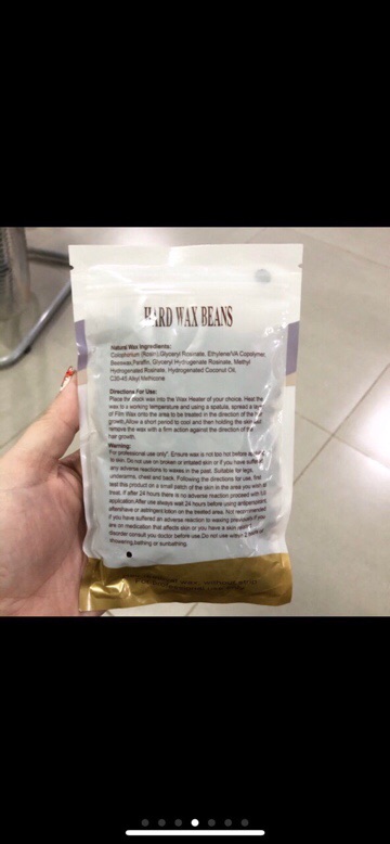 Sỉ : 26k Từ 12 đến 50 bịch ; 24k SÁP WAX LÔNG NÓNG HẠT ĐẬU Sáp wax lông nóng dễ dàng loại bỏ lông trên các vùng cơ thể ( bikini, nách, chân, tay, vùng mặt: ria mép, lông mặt) + THÀNH PHẦN: Sáp ong, vitamin E, coconut oil, tinh chất hoa oải hương… Tinh chất Lavender ( Hoa oải hương) có hương thơm dễ chịu thư giãn , có tác dụng thanh lọc da lấy đi các chất bẩn , độc tố tích tụ trong lỗ chân lông ,cung cấp thêm oxy cho làn da sau khi wax, giúp da sau khi wax nhanh phục hồi các nang lông . Bên cạnh đó, tinh dầu còn có đặc tính sát khuẩn và chống viêm , thích hợp để wax các vùng kín như bikini. + VỆ SINH DA: Vùng da cần wax nên được làm sạch ( để wax được dễ dàng , không dính bụi bẩn) + PHẠM VI SỬ DỤNG: Sử dụng được cho tất cả các vùng cơ thể như: bikini, nách, chân, tay, vùng mặt như ria méo, lông mặt, chân mày…. + CÁCH DÙNG: – Bỏ hạt vào trong nồi đun lửa trực tiếp hoặc bỏ vào lò vi sóng – Để sáp nguội khoảng 40 độ, thử sáp trên mu bàn tay – Dùng thanh gạt phết 1 lớp sáp mỏng phủ kín vùng lông cần wax, theo chiều lông mọc. – Sau đó, dùng que sáp cạy 1 đầu sáp và giật thật mạnh và nhanh theo hướng ngược chiều lông + LƯU Ý: Thử sáp trên mu bàn tay trước khi wax. ( tránh tình trạng sáp còn quá nóng, có thể gây bỏng) Có thể bôi mỡ trăn sau khi wax để làm chậm sự phát triển của lông. Không dùng trên vùng da đang bị viêm và tổn thương. Khối lượng: 100g
