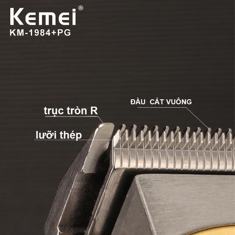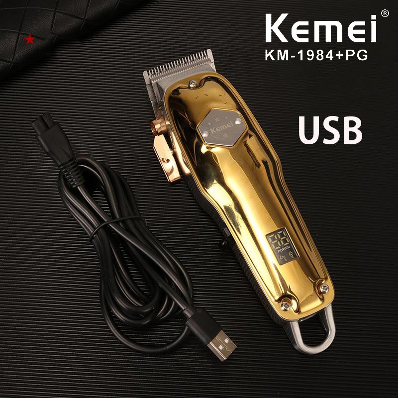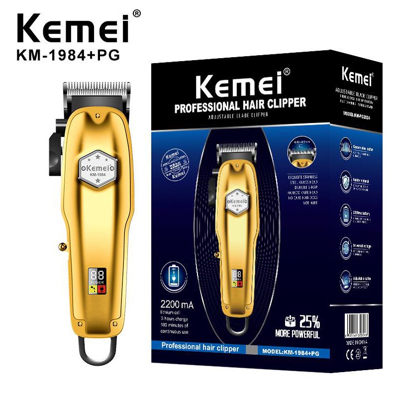 Tông đơ cắt tóc vỏ thép nguyên khối,màn hình hiển thị LCD kemei 1984 PG vàng Dung lượng pin lithium : 2200mAh. Thời gian sạc : 3 giờ,sử dụng liên tục 180 phút. Tăng 25% tốc độ, 4 mức cữ cắt có thể cắt như tông Trấn Cạo Viền. Lưỡi chất liệu thép cacbon siêu bền sắc bén. Máy nhẹ,cầm chắc tay,sử dụng fade và cắt lược đều tốt. Vỏ máy bằng thép nguyên khối cho độ bền cao.. Máy chạy êm ái đường cắt rất ngọt. Công suất: 5w. Điện áp: 110v - 240v,50/60hz.