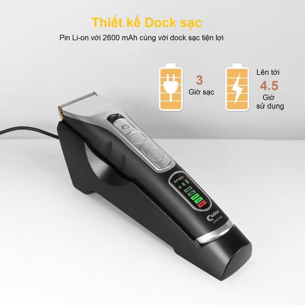 Tông đơ cắt tóc Codos Hàn Quốc, model CHC-918 + Thiết kế chuyên chuyên nghiệp cho solon tóc + Pin Li-on dung lượng cao + Dây sạc dài, có thể cắm điện trực tiếp để cắt, khi bị hết pin +++ Ưu điểm sản phẩm tông đơ Codos CHC-918 ✔️ Chuẩn hàng hiệu, tiếng máy êm ✔️ Lưỡi cắt cố định thép không gỉ phủ ti tan + Lưỡi thép di động Ceramic: sắc bén giúp giảm thiểu ma sát và bền bỉ ✔️ Pin li-on dung lượng cáo 2600 mAh, với 2 kiểu xạc (qua dock hoặc cắm trực tiếp) ✔️ Đông cơ mạnh mẽ 7W với độ dung và độ ồn thấp, được thiết kế với 3 cấp tốc độ, giúp thợ thuyên nghiệp làm việc lâu mà không bị mỏi ✔️ Với nhiều cữ tóc để điều chỉnh: Trên máy (1.0 / 1.3 / 1.6 / 1.9mm), và lắp ngoài ( 3/6/9/12 mm). ĐẶC BIỆC LƯỠI SỨ HỚT AN TOÀN CHO TRẺ EM Phụ kiện kèm theo: ✔️Tông đơ ✔️Củ sạc điện ✔️Dock sạc ✔️Cư lược răng: 3/6m và 9/12mm ✔️Dầu bôi trơn và chổi quét. shop cam kết Chỉ bán hàng Codos 100% - Bảo hành 12 tháng 1 đổi 1 (ko bảo hành linh kiện hao mòn như lưỡi căt và pin) - Hàng mơi 100%, đầy đủ phụ kiện theo thiết kế tiêu chuẩn của hãng - Sản phẩm 100% như hình ảnh mô tả Nhận ship nhanh trong 1 giờ đối với khu Vực TP HCM 0938260205 #tongdocattocchobe #tongdocattocgiadinh
