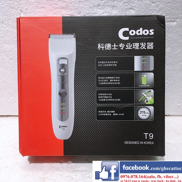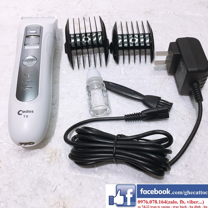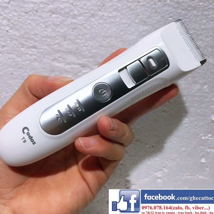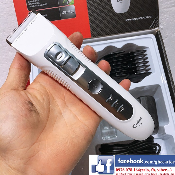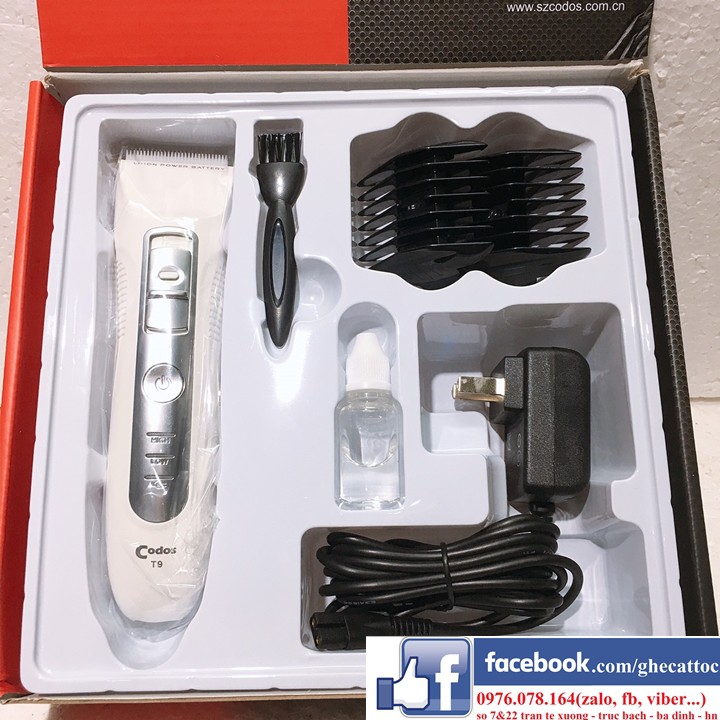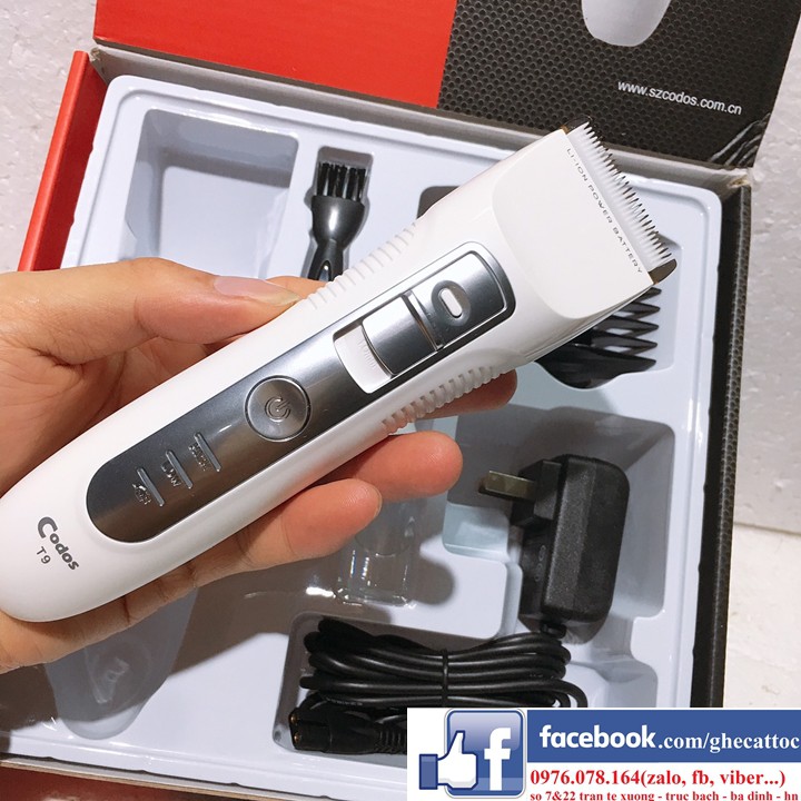 TÔNG ĐƠ CẮT TÓC CHUYÊN NGHIỆP CODOS T9 tông đơ hớt tóc - Tông đơ cắt tóc codos T9 có bán tại Hà Nội, vui lòng liên hệ 0976078164 để được tư vấn ship cod toàn quốc nhận hàng thanh toán, khách hàng có thể mua hàng trực tiếp tại 22 Trần tế xương, Trúc bạch, Ba đình, Chế độ bảo hành 1 đổi 1 trong 10 ngày đầu, bảo hành 6 tháng lỗi của nhà sản xuất tông đơ hớt tóc - Tông đơ cắt tóc codos T9 là dòng tông đơ được sử dụng đa năng từ cá nhân, tiệm tóc salon tóc cắt hớt tóc nam nữ, barber trong quán barbershop hoặc cũng có thể sử dụng tại các bệnh viện thú cưng, cắt lông cho thú cưng .... Nhà sản xuất : Codos Tên sản phẩm : Tông đơ Codos T9 Chất liệu : Vỏ máy : Nhựa nguyên chất Lưỡi cố định : thép chống gỉ mạ đồng cao cấp Lưỡi di chuyển : Ceramic siêu bén Nguồn : pin sạc Pin : 1000mAh Điện áp : AC 110-220v, 50Hz Công suất :7 w Thời gian sạc đầy : 3 tiếng Thời gian sử dụng : 270 phút liên tục. Màu sắc : trắng sứ phối nhũ bạc Kích thước máy : 18 x 4.5 x 4 cm Kích thước hộp đựng : 23 x 22 x 5.5 cm Khối lượng toàn bộ sản phẩm :500 gram Bộ sản phẩm gồm : 1 máy + bộ vệ sinh ( 1 chổi và 1 lọ dầu ) + 2 lược chỉnh với 4 đầu cữ ( 3, 6 , 9, 12 mm ). hmyot7_simg_d0daf0_800x1200_max.jpg HƯỜNG DẪN SỬ DỤNG : - Sạc đầy pin trước khi sử dụng. Đèn báo xanh khi pin đang được sạc, đèn sẽ tự tắt khi pin đã được sạc đầy. - Trước khi bắt đầu chọn lược căn độ dài thích hợp cho mục đích của bạn. -Trước khi sử dụng nên tra dầu bôi trơn vào đầu lưỡi thì khi cắt sẽ bén hơn và máy chạy êm hơn. - Bật công tắc nguồn để bắt đầu công việc cắt tỉa. - Sau khi sử dụng xong vệ sinh máy sạch sẽ và bảo quản máy nơi khô ráo. uGbLQu_simg_d0daf0_800x1200_max.jpg Sản phẩm thích hợp dùng cho : -Du học sinh , công nhân lao động xuất khẩu , bộ đội đi làm ở vùng sâu , vùng xa… - Gia đình có người già , yếu mệt hay trẻ em mà thời gian bận rộn , eo hẹp …khó bố trí đưa trẻ đi cắt tóc được hoặc trẻ không muốn người lạ cắt tóc cho , hay không muốn trẻ bị viêm nhiễm không đáng có… Cảm ơn các bạn đã quan tâm , tin tưởng , lựa chọn sản phẩm của shop . Để sử dụng sản phẩm bền và hiệu quả nhất , xin quý khách lưu ý một số điểm sau : Trước khi sử dụng sản phẩm nên tra 1-2 giọt dầu vào lưỡi cắt giúp cắt ngọt hơn , sắc lâu hơn . Sau khi sử dụng thì dùng chổi vệ sinh lưỡi cắt sau đó tra 1-2 giọt dầu giúp lưỡi cắt luôn sạch sẽ và không bị gỉ . Hạn chế sạc quá giờ , để máy hết kiệt pin lâu ngày , luôn tục cắm điện trưc tiếp khi sử dụng vì như vậy sẽ ảnh hưởng tới tuổi thọ của pin. Tuyệt đối không rửa tông đơ vào nước vì có thể gây chạm chập các mạch hay pin trong máy . Qúy khách có thể xem thêm các sản phẩm tông đơ cắt tóc khác của shop tại đây Trên đây là một số lưu ý khi sử dụng và bảo quản sản phẩm . Chúc quý khách sử dụng sản phẩm hiệu quả .