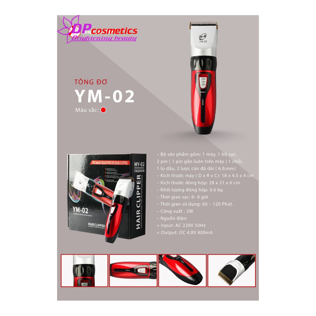 TÔNG ĐƠ CẮT TÓC: YM-02 ✨ Mô tả: - Được sản xuất trên dây chuyền công nghệ tiên tiến, có độ bền cao. - Kích thước và thiết kế sản phẩm dễ cầm, dễ thao tác cũng như đem lại cảm giác thoải mái cho người dùng. - Công suất cao, động cơ mạnh mẽ, bền bỉ mà vẫn êm ái, không rung, không ồn thích hợp sử dụng cho cả trẻ nhỏ và người già. - Bộ sản phẩm ngoài thân máy, các cữ lược, dụng cụ vệ sinh còn được trang bị thêm 1 pin sơ cua để đảm bảo việc sử dụng được lâu dài hơn. ✨ Màu sắc: đen-đỏ - Bộ sản phẩm bao gồm: 1 tông đơ, 4 lược điều chỉnh độ dài ( từ 3-12 mm), 1 lọ dầu máy, 1 chổi vệ sinh, 2pin, 1 sạc. - Thông tin chi tiết - Điện áp : 220V ~ 50Hz. - Công suất: 3W. #tóc, #tông, #đơ, #Tông đơ,