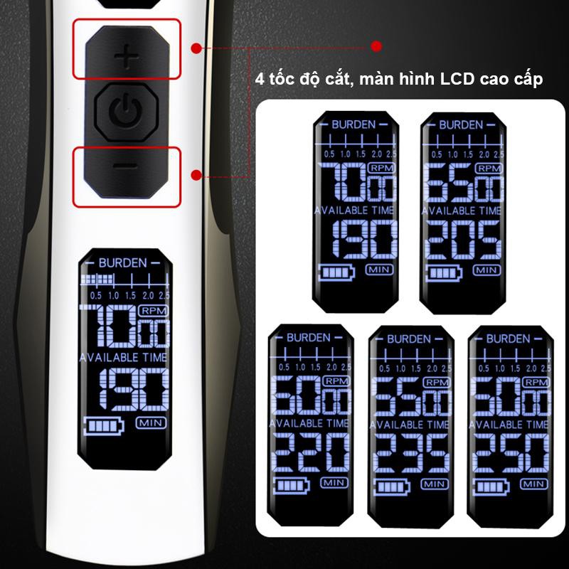 Hãng sản xuất: huaerbo Tông đơ cắt tóc chuyên nghiệp Màn hình hiển thị LCD. tốc độ cắt,thời gian,tra dầu, Máy 5 tốc độ cắt cực khỏe, chế độ mạnh 7000 vòng/phút Thời gian sử dụng 300 phút, pin 2600mah Đầu cắt bằng thép mạ titan công nghiệp Sản phẩm: máy x 4 cữ x lọ dầu x chổi