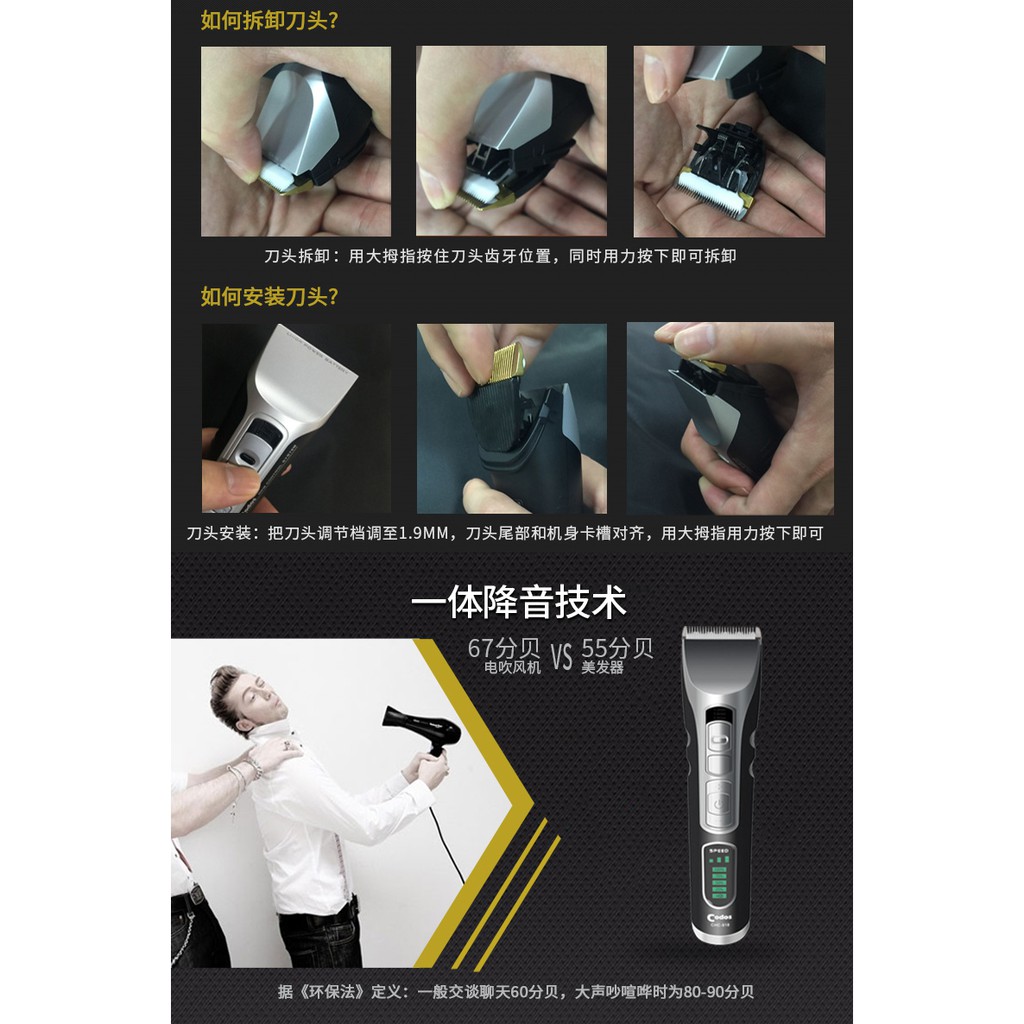 Mô tả: TÔNG ĐƠ CẮT TÓC CHUYÊN NGHIỆP CODOS CHC-918 Lần đầu tiên xuất hiện tại Việt Nam dòng tông đơ cắt tóc chuyên nghiệp, với nhiều tính năng vượt trội hơn hẳn các dòng tông đơ trước đây. Hôm nay Codos Việt Nam sẽ cùng các bạn nghiên cứu về sản phẩm tông đơ Codos CHC-918, dòng tông đơ cắt tóc cao cấp nhất hiện nay các bạn nhé. tông đơ cắt tóc Thông tin sản phẩm: – Tông đơ cắt tóc Codos CHC-918. – Màn hình LCD hiển thị thời gian pin và tốc độ. – Điều chỉnh tốc độ nhanh, chậm. – Được thiết kế bởi KOREA. – Màu sắc: Đen Slivery. – Adapter: Input AC 100 ~ 240V / 50-60 Hz – Output: DC 3.5V 1000mA – Pin: Li-Polymer pin 3.7V 2200mAh X 1PC – Thời gian sạc pin: 3 giờ sạc nhanh – Thời gian sử dụng: 4 giờ. Những tính năng vượt trội của Codos CHC-918: – Động cơ mạnh mẽ, có thể điều chỉnh tăng giảm tốc độ. – Lưỡi dao bằng sứ siêu bén, lâu mài mòn được bọc bằng bằng Titan siêu cứng giữ lưỡi dao cố định. – Sử dụng pin lithium-ion công suất lớn thời gian sử dụng pin cao cấp 2 lần so với các dòng thông thường, có thể lên tới 3h liên tục. – Có màn hình LCD hiển thị thông số thời gian và tốc độ hiện tại. – Có sạc đứng thuận lợi, vừa làm giá để tông đơ tiện dụng. – Lưỡi dao có thể tháo rời tiện cho việc vệ sinh và thay thế khi mài mòn, sử dụng lâu năm. Bộ sản phẩm tông đơ cắt tóc chuyê nghiệp CODOS CHC-918 bao gồm:Tông đơ cắt tóc CHC-918, cục sạc, 1 đế sạc đứng, 2 gá 3 / 6mm và 9 / 12mm, chai dầu máy, lược vệ sinh máy. - Bảo hành: 6 tháng Chú ý khi sử dụng: -Trước khi sử dụng nên tra dầu bôi trơn vào đầu lưỡi thì khi cắt sẽ bén hơn và máy chạy êm hơn. - Mỗi khi sử dụng xong cần vệ sinh tông đơ sạch sẽ và bảo quản nơi khô ráo. - Không sử dụng chất tẩy rửa tránh bị ăn mòn - Sạc pin quá lâu sẽ làm giảm tuổi thọ của máy #tongdocattoc #tongdo #tongdocattocchuyennghiep #tongdocaocap #tongdocattoctreem #tongdochobe #tongdogiare #ton #tongdocodos #tongdocattockhongday #tongdocattocchobe #tongdocattoccaocap #tongdocatlongthu