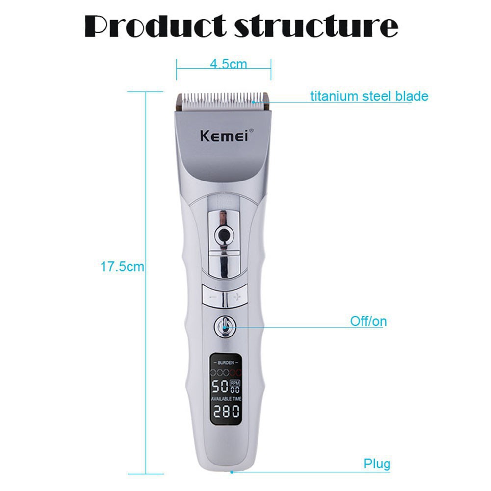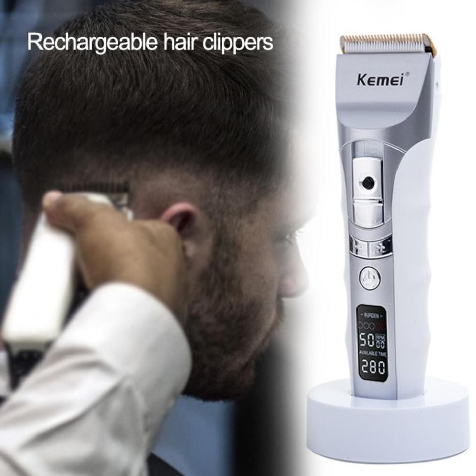 Description: The intelligent ceramic hair clipper is designed with safe & sharp ceramic blades. It features long running time, the strong powered lithium battery keeps the wireless clipper working up to 200 minute after 3 hours charged by using the adapter or with stand. Suitable for all kinds of hair. Parameters: Product: Rechargeable hair clippers Model: KM-838 Input voltage: AC 100-240 V 50 / 60Hz Power: 3 watts Charging: 3 hours Use time: about 200 minutes Product size: about 17.5 * 4.5cm/6.89*1.77in Machine weight: about 222g Color: silver Ultimate combing: 3.6, 9.12 mm List: 1*Host 1*Charging base 1*Maintenance oil 1*Cleaning brush 4*Limit comb (3.6, 9.12 mm) 1*Instruction manual Tips: Feel free to contact us for any problem and we are there doing our best to make every customer satisfied.