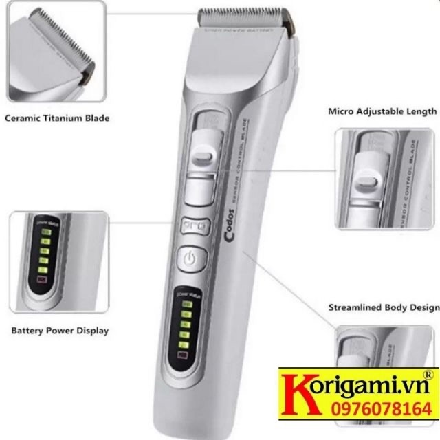 Tông Đơ Cắt Tóc Codos-CHC-916 Giới thiệu: Chất lượng tuyệt vời bằng titan phủ bằng thép không rỉ lưỡi cố định và lưỡi dao gốm mang lại hiệu suất cắt tuyệt vời sau thời gian cắt vẫn có thể giữ độ sắc nét cho tóc. Màu sắc : Màu (trắng bạc) Adapter : Input AC220V 50Hz Output :DC3.5V 1000mA Pin : Li-Polymer 3.7V 2200mAh X 1PCS Thời gian sạc : 3 giờ Thời gian sử dụng nhanh : 4,5 giờ Tính năng, đặc điểm: Động cơ mạnh 3,6 V làm việc với tiếng ồn rất nhỏ; Điều chỉnh chính xác hơn 4 bước chiều dài thông qua bộ điều chỉnh tích hợp; Pin Li-polymer có thể sạc lại được có thể được sạc đầy chỉ trong 180 phút và giữ 270 phút sử dụng không dây liên tục; Pin Li-Polymer có chức năng bảo vệ quá tải; 4 màn hiển thị LED hiển thị trạng thái điện và trạng thái điện vẫn còn; Lưỡi tháo có thể tháo rời dễ dàng và thuận tiện cho việc làm sạch; Rung động thấp, tiếng ồn nhỏ; Bảo vệ quá tải; Thiết kế Ergonomic cung cấp dễ dàng nắm; Có thể sạc / sạc; Phụ kiện đính kèm : Cữ 3 / 6mm 9 / 12mm, bình dầu, bàn chải làm sạch