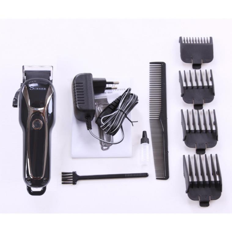 thông tin sản phẩm; -Tên sản phẩm :Tông đơ cắt tóc không dây chuyên nghiệp dành cho mọi lứa tuổi. - Thương hiệu : Surker SK-805 - Model : Surker SK-805 - Chất liệu : Kim loại và nhựa cao cấp, an toàn. - Màu sắc : Đen phối bạc - Nguồn điện : 100-240V. - Công suất : 6W 50/60Hz. - sản phẩm : 19x6x6cm – 300g. - Hộp đựng : 25x17x6.5 cm – 750g. - Bộ sản phẩm bao gồm : 1 x Tông đơ, 4 x Lược căn độ dài tóc, 1x Adapter, 1 x Chai dầu máy, 1 x Chổi vệ sinh máy. Tông Đơ Chuyên Nghiệp Surker SK-805. Chất liệu nhựa và kim loại cao cấp với các đường nét được thiết kế cách điệu, với trọng lượng nhẹ chỉ 300g nhưng tông đơ Surker SK-805 mang lại cảm giác rất chắc chắn khi cầm nắm và rất đằm khi sử dụng. Đèn led báo pin tiện dụng , giúp bạn kiểm soát và chủ động sạc pin Chức năng turbo giúp tăng sức mạnh động cơ khi gặp tóc cứng ,dầy. Với viên pin Lithium-ion siêu khủng cho thời gian sử dụng không dây lên đến 120 phút trên 1 lần sạc đầy , thời gian sạc chỉ có 2,5 giờ Động cơ quay rất mạnh mẽ, cộng thêm với lưỡi cắt bằng titanium không gỉ được đặt rất sát nhau giúp bạn có thể cắt tóc cho mọi lứa tuổi một cách êm ái mà không sợ đau khi cắt. Đi kèm với Surker SK-805 là 4 lược căn độ dài tóc khi cắt : 3mm, 6mm, 10mm, 13mm. Thân máy còn có cần gạt để điều chỉnh độ dài tóc từ 1mm-2.5mm Rất tiện sử dụng ngay cả đối với người sử dụng lần đầu mà không làm hư kiểu tóc với độ dài tóc được giới hạn từ 1.5mm – 15.5mm theo ý muốn. HƯỚNG DẪN SỬ DỤNG : Trước khi sử dụng sản phẩm nên tra 1-2 giọt dầu vào lưỡi cắt giúp cắt ngọt hơn , sắc lâu hơn . Sau khi sử dụng thì dùng chổi vệ sinh lưỡi cắt sau đó tra 1-2 giọt dầu giúp lưỡi cắt luôn sạch sẽ và không bị gỉ . Hạn chế sạc quá giờ , để máy hết kiệt pin lâu ngày , luôn tục cắm điện trưc tiếp khi sử dụng vì như vậy sẽ ảnh hưởng tới tuổi thọ của pin. Tuyệt đối không rửa tông đơ vào nước vì có thể gây chạm chập các mạch hay pin trong máy . Trên đây là một số lưu ý khi sử dụng và bảo quản sản phẩm . Cảm ơn quý khách đã tin tưởng , đồng hành và sử dụng các sản phẩm của shop. Chúc các bạn vui vẻ và sử dụng sản phẩm hiệu quả. -liên hệ sđt 0986933290