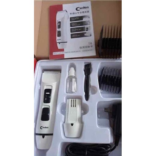 Tông đơ cắt tóc Codos t6THUỘC TÍNH SẢN PHẨM Xuất xứ: Châu Á. CHI TIẾT SẢN PHẨM ✅ĐĂC ĐIỂM NỔI BẬT -Vỏ máy : nhựa -Lưỡi cố định : thép cao cấp -Lưỡi di chuyển : sứ Ceramic 🔶Thông Số Chi Tiết Về Tông Đơ Codos T6 -Nguồn : pin sạc Pin : 900mAh Điện áp : AC 110-220v, 50Hz Công suất : 3W Thời gian sạc đầy : 4-5 tiếng Thời gian sử dụng : 90-180 phút liên tục. Màu sắc : trắng phối hợp đen Kích thước máy : 17 x 4.5 x 4 cm Kích thước hộp đựng : 22 x 17 x 5.5 cm Khối lượng toàn bộ sản phẩm : 450 gram Bộ sản phẩm gồm có : 1 máy (pin kèm theo + pin sơ cua) + bộ vệ sinh ( 1 chổi và 1 lọ dầu ) + 2 lược chỉnh với 4 đầu cữ ( 3, 6 , 9, 12 mm ), 💥Chú ý: Trước khi sử dụng nên tra dầu bôi trơn vào đầu lưỡi thì khi cắt sẽ bén hơn và máy chạy êm hơn. Mỗi khi sử dụng xong cần vệ sinh tông đơ sạch sẽ và bảo quản nơi khô ráo. Tránh xạc pin trong thòi gian quá lâu sẽ là chai pin