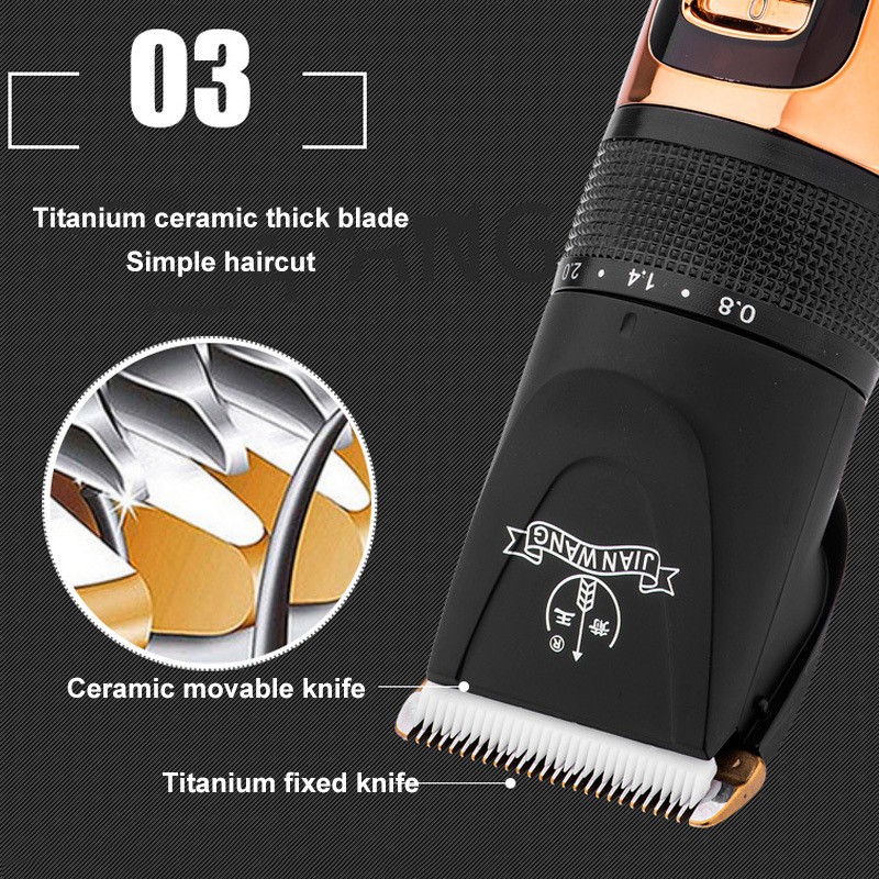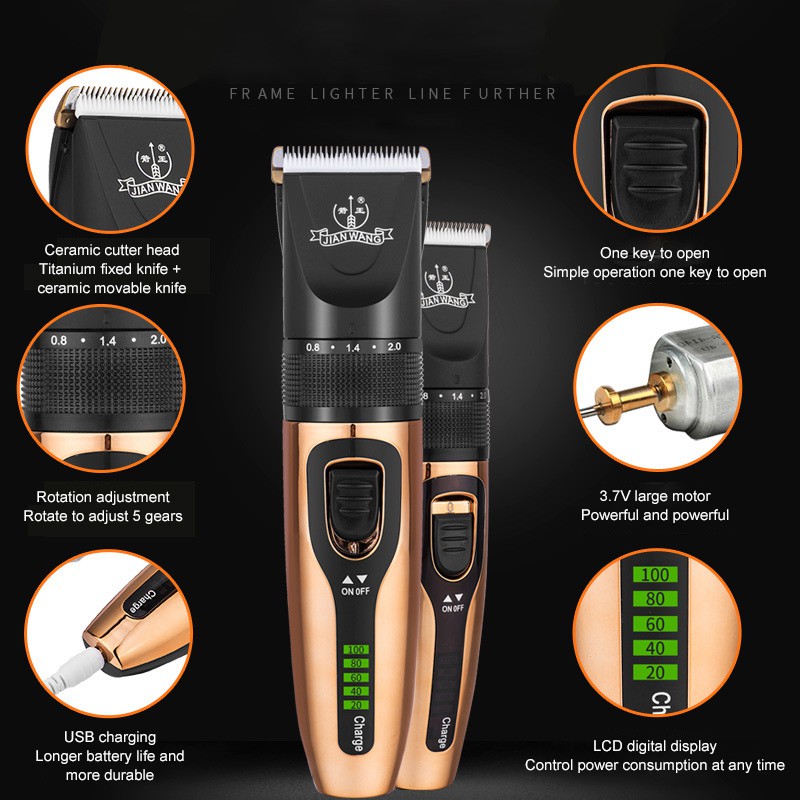 1.USB charging, suitable for power bank, notebook, more convenient charging. 2.The R-angle cutter head will not hurt the skin when it comes in contact with the skin at all angles, ensuring safety. You can rest assured to give your baby a haircut. 3.Upgrade the LCD digital display, clearly understand the power consumption, the percentage display, and no longer be afraid of running out of power during a haircut. #JIANWANG S700P #Hair Clipper #LCD Digital Display #Usb Charging #5-speed Fine-tuning Power Type:Rechargeable/Electric Both Work Voltage:Global Universal(100-240V) Blade Material:Titanium Alloy Charging Time:2h Usage Time:160Mins Target Audience:Universal Origin:CN(Origin) Hair Clippers X 1