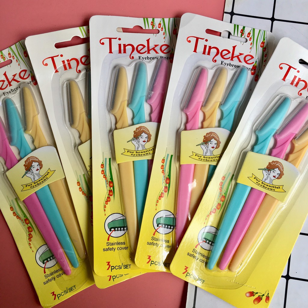 Dao cạo lông mày Chất liệu: Nhựa cao cấp, thép không gỉ Màu sắc: Hồng, xanh, vàng Bộ 3 dao cạo lông mày Tinkle tạo dáng cho chân mày bạn gái được hoàn hảo, như ý và quyến rũ. Giúp cho các bạn gái dễ dàng chăm sóc, làm đẹp chân mày. Sản phẩm rất thiết thực đối với những bạn gái để trang điểm, kích thước nhỏ gọn tiện mang theo bên mình - Dễ sử dụng, kiểu dáng gọn đẹp, không gây đau rát hay kích ứng da. - Lưỡi dao kép thiết kế thông minh giúp dễ dàng cạo bỏ những vùng lông không mông muốn như lông mày thừa, lông mặt, ria mép... mà không gây trầy xước da.