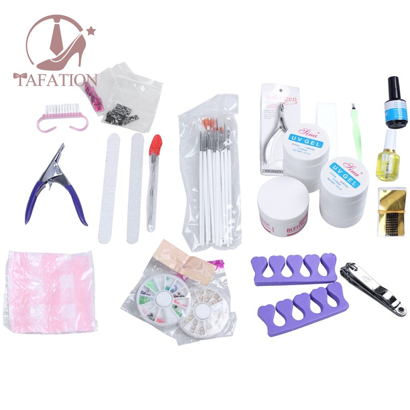 In the kit, it is a: 2 x 1/2 oz clear Gel, 1 x 1/2 oz white Gel, 1 x 1/2 oz pink Gel, 1 x 1/2 oz UV Top Coat, 2 x file, 20 x forms, 20 x white Capsules, 20 x transparent Capsules, 1 x oil, 1 x brush, 1 x er, 1 x clippers , 1 x cream, 1 x blade-, 1 x rope, 1 x scissors, 2 x separate-toes, 1 x block buffer, 2 x rhinestone and 15 x brush this product does not contain lamp This product does not contain instructions Color could will vary a bit in case under different lighting or on the screen of various powers separators NOTE: cleanser no more, no glue Material: Plastic Kit of manicure UV gel (cleanser no more, no glue) In the kit, it is a: 2 x 1/2 oz clear Gel 1 x 1/2 oz white Gel 1 x 1/2 oz pink Gel 1 x 1/2 oz UV Top Coat 2 x file 20 x forms 20 x white Capsules 20 x transparent Capsules 1 x oil, 1 x brush 1 x er 1 x clippers 1 x cream 1 x blade- 1 x rope 1 x scissors 2 x separate-toes 1 x block buffer 2 x rhinestone and 15 x brush Note:Light shooting and different displays may cause the color of the item in the picture a little different from the real thing. The measurement allowed error is +/- 1-3 cm.
