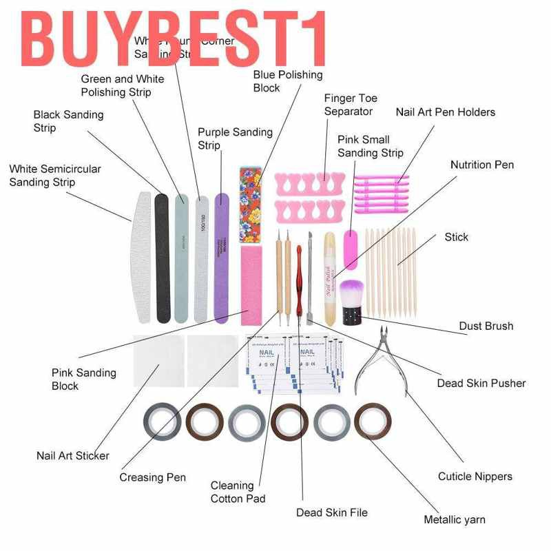 Feature: 1. Equipped with different tools, suitable for home use, beauty and nail shops, easy to use, suitable for nail DIY. 2. Dead skin file can effectively remove dead skin, nail file helps to polish nail surface. 3. Suitable for beginners and professionals to use to meet different needs. 4. The product set includes nail sanding strip, metallic yarn, nutrition pen and other nail art tool, easy to use. 5. Using high‑quality materials, non‑toxic and harmless, eco‑friendly and healthy, it can be used with confidence. Specification: Condition: 100% Brand New Item Type: Manicure Tool Set Material: Sponge, acrylic, etc. Uses: Household, nail salon, etc.Size: As Shown in the Picture Package List: 1 x Cuticle Nippers 1 x Purple Sanding Strip 1 x White Round Corner Sanding Strip 1 x White Semicircular Sanding Strip 1 x Black Sanding Strip 1 x Green and White Polishing Strip 1 x Pink Small Sanding Strip 1 x Pink Sanding Block 1 x Blue Polishing Block 1 x Nutrition Pen 1 x Dead Skin File 1 x Dust Brush 2 x Finger Toe Separator 1 x Dead Skin Pusher 10 x Cleaning Cotton Pad 2 x Nail Art Sticker 10 x Multifunctional Stick 6 x Metallic Yarn 1 x Nail Art Pen Holders 2 x Creasing Pen Note: 1. Please allow slight error due to manual measurement. Thanks for your understanding. 2. Monitors are not calibrated same, item color displayed in photos may be showing slightly different from the real object. Please take the real one as standard.