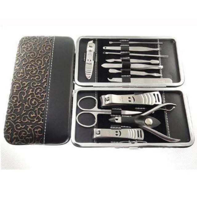 Bộ bấm móng 12 món inox hàng loại 1 bằng inox nha khách Bộ sản phẩm gồm 12 món: 3 đồ bấm móng tay lớn + vừa + nhỏ, kéo cắt lông mũi, kềm cắt da, cây nặn mụn, 1 cây móc tai, 1 dũa, 1 nhíp, 2 cây lấy khóe, 1 dụng cụ làm sạch móng. – Màu sắc: Trắng – Bao bì: Hộp kim loại bọc giả da (16×8.5x2cm)
