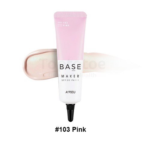 Kem lót che phủ lỗ chân lông và đều màu da thế hệ mới Apieu Base Maker - Xuất xứ: Hàn Quốc - Khối lượng: 20g 1. Là dòng kem lót thế hệ mới 3 trong 1: Chống nhăn + Kem chống nắng + Kem lót. 2. Đã kiểm nghiệm không gây kích ứng da đặc biệt là làn da nhạy cảm. 3. Thành phần chiết xuất từ Olive giúp dưỡng ẩm cho da hiệu quả, bổ sung độ ẩm giúp da không bị mất nước. 4. Độ chống nắng từ SPF15 đến 37 giúp làn da chống chịu dưới ánh nắng nhiều giờ liền. 5. Kem lót cân chỉnh tông da, khắc phục khuyết điểm sắc tốt da, giúp kem nền bám lâu, giúp da bắt sáng và trở nên tươi sáng, trong trẻo hơn hẳn. 101 - Glow (tím): Điều chỉnh tone da vàng, xỉn màu, sạm, tái. Tạo hiệu ứng ánh ngọc trai, giúp làn da tươi sáng rạng ngời, tràn đầy sức sống trong nhiều giờ liền. SPF15 PA++ 103 - Pink : thích hợp với làn da trắng, xanh xao, giúp da tươi tắn, hồng hào có sức sống hơn.
