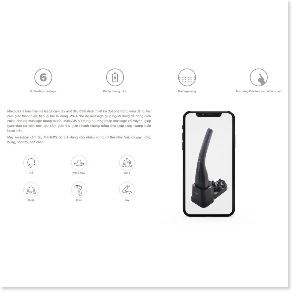 Máy massage cầm tay Maxcare Max631S là loại máy massage cầm tay một đầu đấm được thiết kế đột phá trong kiểu dáng, tạo cảm giác thân thiện, tiện lợi khi sử dụng. ĐẶC ĐIỂM NỔI BẬT : - Thiết kế dạng cầm tay, nhỏ gọn và dễ sử dụng cho bất cứ ai. - Phần tay cầm được thiết kế thông minh với chất liệu chống mồ hôi, chống trơn trượt. - Chất liệu thân máy bằng nhựa cao cấp với gam màu trắng - xám hiện đại và sang trọng. - Bảng điều khiển với phím bấm điện tử được thiết kế hiện đại, sang trọng và dễ thao tác với công nghệ one-touch một điểm chạm. - Sản phẩm đi kèm với đế sạc rời an toàn và thuận tiện cho người sử dụng. Việc thiết kế đế sạc rời cũng giúp bạn dễ dàng mang theo tới nơi làm việc hoặc đi du lịch, công tác. - Máy massage cầm tay trị liệu Maxcare Max631S được thiết kế với một đầu đấm cố định và 5 đầu massage thay thế cho bạn nhiều lựa chọn massage hơn THÔNG TIN SẢN PHẨM : - Tên sản phẩm : Máy massage cầm tay Maxcare Max631S - Màu sắc : Trắng Xám - Chất liệu : Nhựa cao cấp - Dung lượng pin : 1800mAh - Công suất : 12W - Kích thước : 403*81mm - Nguồn điện : DC8.4V #maymassagecamtay #massagecamtay #massagecamtaykhongday