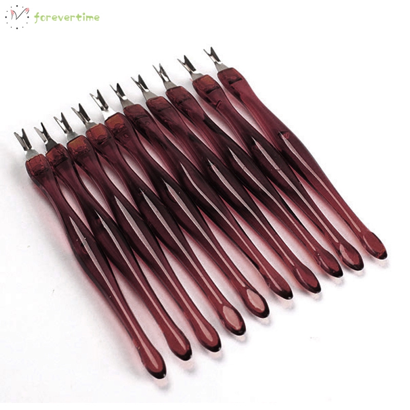 Decription: Features: Color: As the picture shown Length: Approx. 11cm Quantity:10 Pcs Cuticle pedicure tool with sharp V-shaped blades safely and quickly trims excess cuticles and hangnails Rounded end doubles as a cuticle pusher tool Stainless steel head and plastic handle Cuticle trimmer is suitable for professional salon use or home use Professional nail art tool for nail technician Suitable for professional, nail salon, nail art school / college, nail art artist and personal / home use, etc Included: 10 x Cuticle Pushers