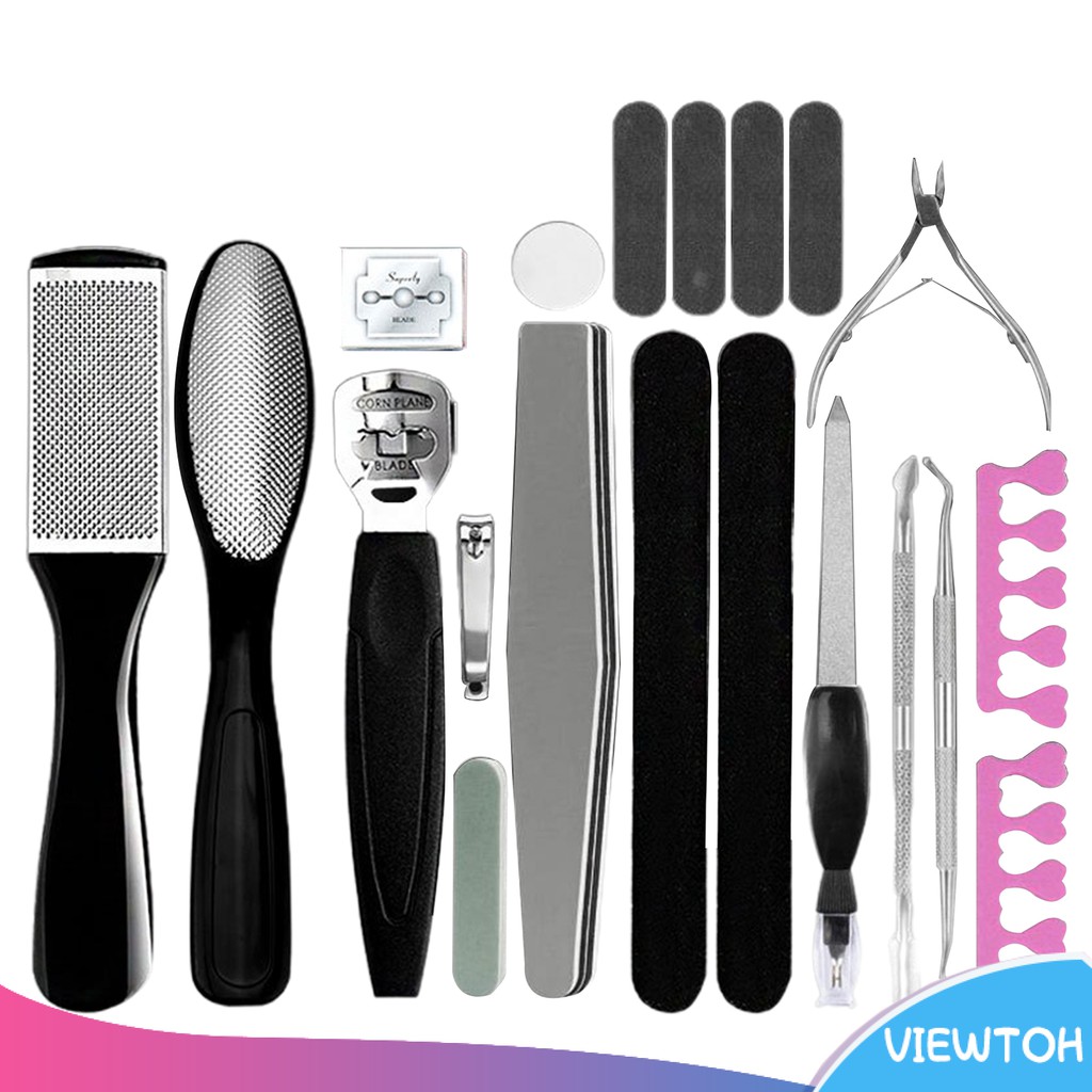 Product description This 18 in 1 Manicure Pedicure set, You Can Use it for Manicuring, Eyebrow Shaping, Anti-Acne and Exfoliating. One Tools set Can Meet Your Many Requires. Package Included Detail with Tool Instruction: 2 * Nail Clippers: Trim finger nails 1 * Large Nail Clipper: Trim hard and thick toenails 1 * Cuticle Nipper: Trim cuticles 1 * Nail File: Make nails rounded, smooth 1 * Dead Skin Fork: Trim surface, agnail, callus, dead skin, etc 1 * Tweezer: pluck eyebrow and ingrown hairs 2 * Scissors: trim eyebrow 1 * Nail Cleaning Knife: Cleaning dirt in nails 1 * Cuspidal/Obtuse push-type broach: trim nail keratin and remove scrape nail polish 2 * Ear Pick: Ear cleaning 2 * Acne Tool:Blackhead/Acne removing, acne treatment 1 * Flat Callus Remover: Cleaning dead skin on foot 1 * Oblique Callus Remover: Cleaning dead skin on foot 1 * Zigzag Callus Remover: Cleaning deak skin on foot EASY TO CARRY: Mini size of 6.2 x 4.5 x 1 inches, very portable to carry when you go to travel. Professional manicure kit is a perfect gift for yourself, families and friends. Useful set, protect your nail health, make you tidy and clean.